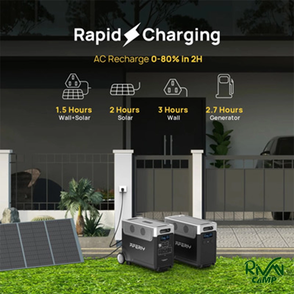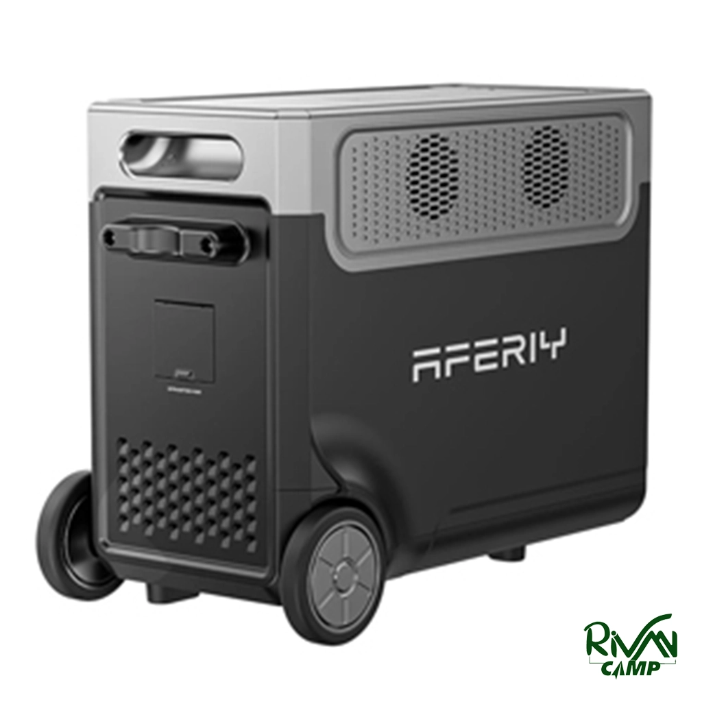پاور استیشن آفیری 3600 وات با ظرفیت ۳۸۴۰ واتساعت، توان خروجی ۳۶۰۰ وات، باتری LiFePO₄ با بیش از ۴۰۰۰ چرخه، شارژ از برق و پنل خورشیدی، طراحی قابل حمل با دسته و چرخ، پشتیبانی از حالت UPS.