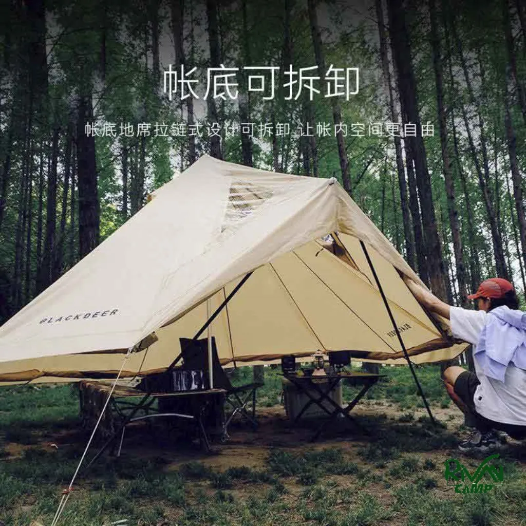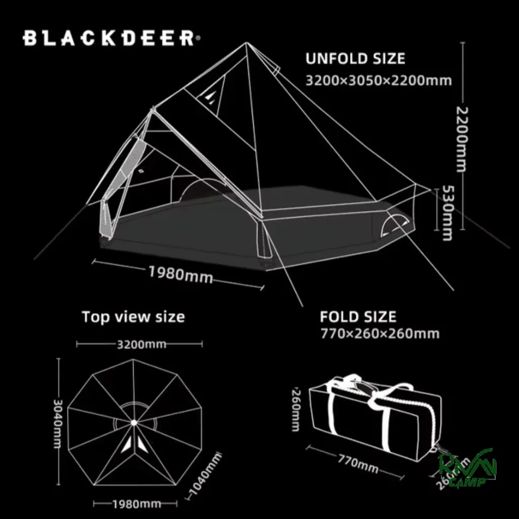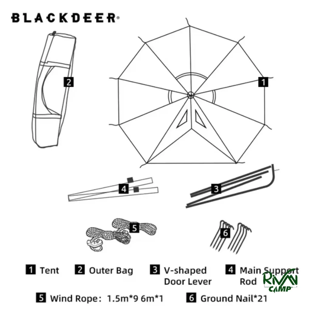 چادر 12 نفره بلک دیر Black Deer از پارچه آکسفورد ۲۱۰D ضدآب با کف پلیاتیلن ضد رطوبت ساخته شده و برای استفاده در تمام فصول مناسب است. ارتفاع داخلی ۲۲۰ سانتیمتر، تهویه با دو درب پشهبنددار، تیرکهای آلومینیومی مقاوم و وزن ۱۲.۲ کیلوگرم از دیگر ویژگیهای کاربردی آن هستند.
