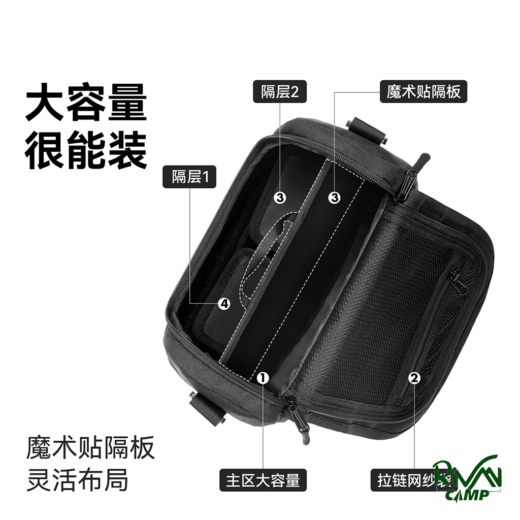 کیف تاکتیکال بلک داگ CBD2450XB018 با ابعاد 14*22*27 سانتیمتر، وزن ۷۳۰ گرم، بدنه مقاوم ۹۰۰D اکسفورد، لایه داخلی مش نایلونی، بخشهای جداگانه داخلی، بند شانهای قابل تنظیم، دسته دستی، جمعشدنی، مناسب سفر و فعالیتهای فضای باز.