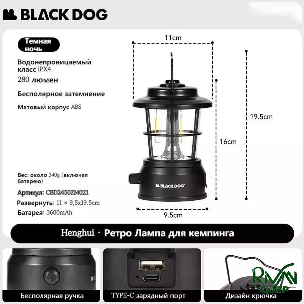 چراغ کمپینگ مینی رترو بلک داگ مدل CBD2450ZM021 ترکیبی از طراحی کلاسیک و فناوری مدرن است. این چراغ با ظاهر سنتی، حس نوستالژی را تداعی می‌کند، اما در دل خود امکانات پیشرفته‌ای دارد که آن را به همراه عالی در کمپینگ تبدیل می‌کند. ابعاد چراغ کمپینگ قدیمی بلک داگ 19.5 در 9.5 در 11 سانتی‌متر و وزن آن حدود 340 گرم است. چراغ کمپینگ قدیمی (هنگ هوی) BLACKDOG مدل CBD2450ZM021 یک باتری با ظرفیت 3600 میلی‌آمپر ساعت دارد و از استاندارد IPX4 (مقاومت در برابر پاشش آب) پشتیبانی می‌کند. شارژدهی این چراغ بسیار بالا است و برای مثال اگر از حالت فیلامنت نور کم استفاده کنید، چراغ تا 170 ساعت نوردهی خواهد داشت.