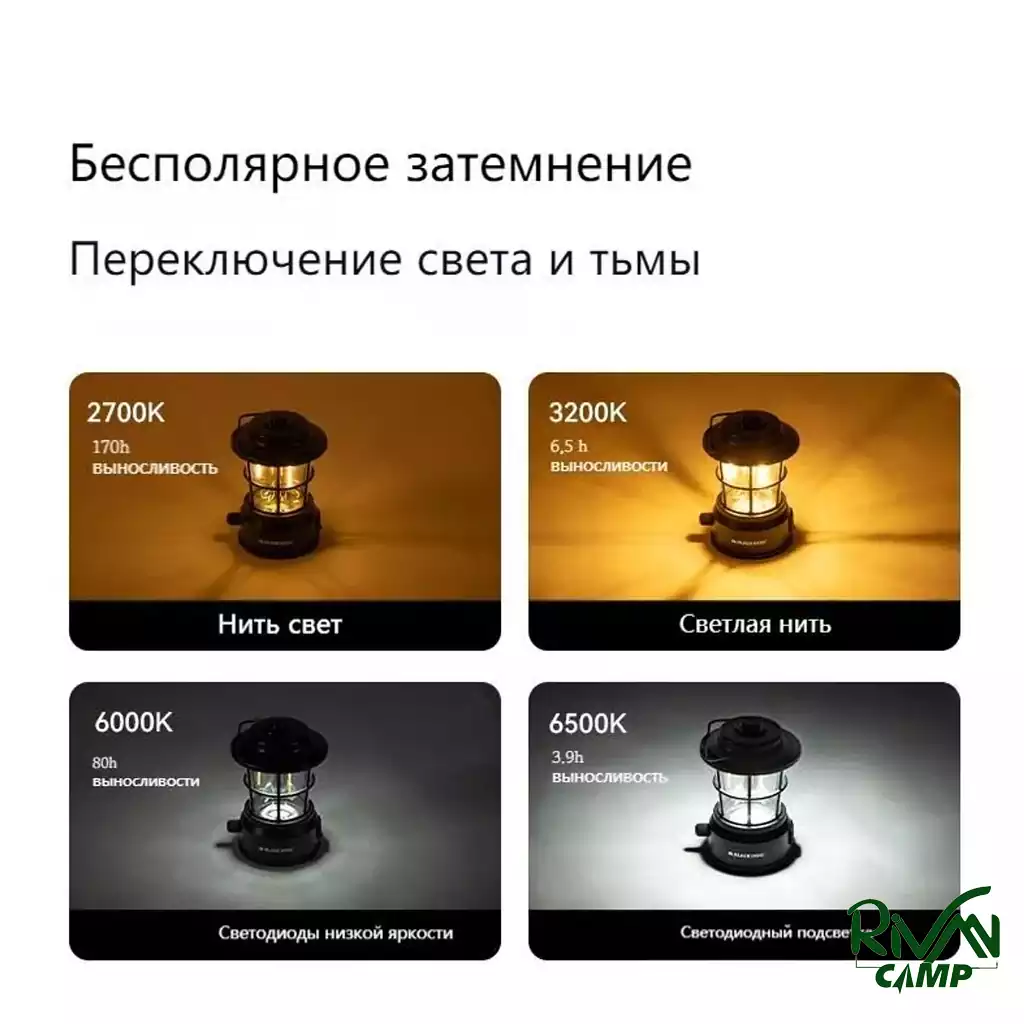 ظرفیت باتری این چراغ 3600 میلی‌امپر ساعت است و تا ساعت‌ها می‌تواند روشنایی را فراهم کند. چراغ کمپینگ مینی رترو چهار حالت نوردهی دارد که میزان ماندگاری باتری در هر کدام از آن‌ها به شکل زیر است: