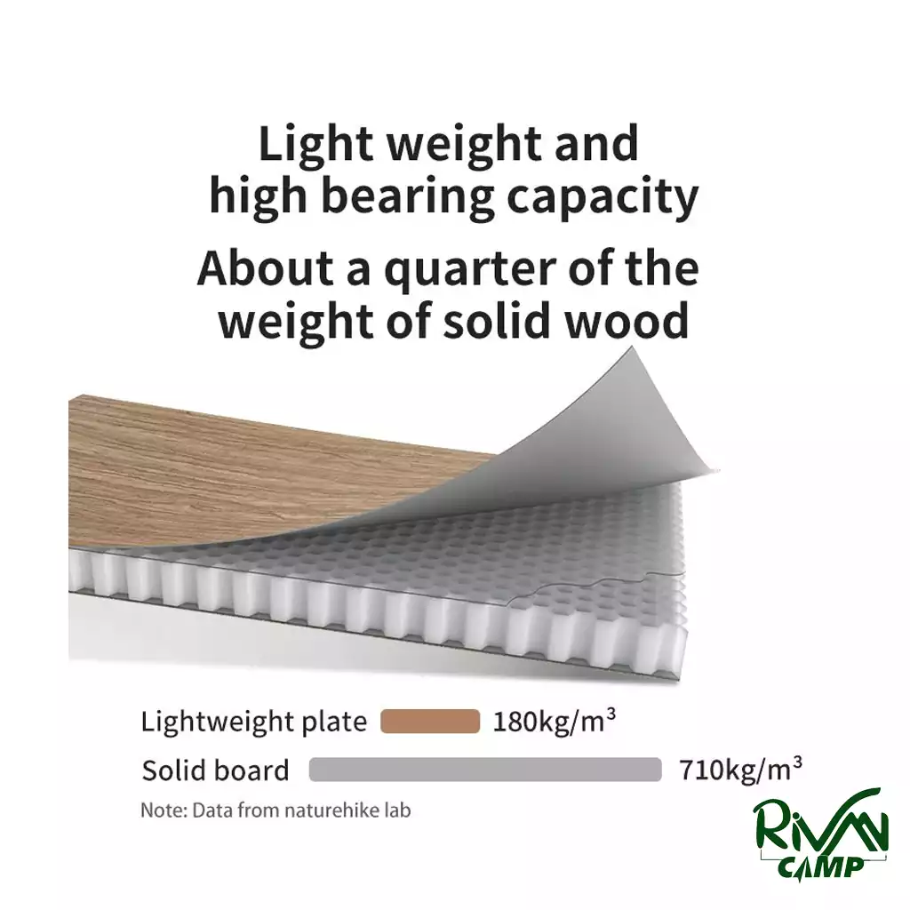 صفحه میز تاشو با ارتفاع قابل تنظیم نیچرهایک مدل CNH22JU054 از برد لانه زنبوری با هسته پلاستیکی ساخته شده است که علاوه بر سبکی، مقاومت بالایی در برابر فشار و ضربه دارد. این ساختار باعث میشود میز در عین وزن کم، استحکام بالایی در استفاده طولانیمدت دارد. پایههای میز از آلیاژ آلومینیوم ساخته شدهاند که برابر زنگزدگی مقاومت است و پایداری مناسبی ایجاد میکند.