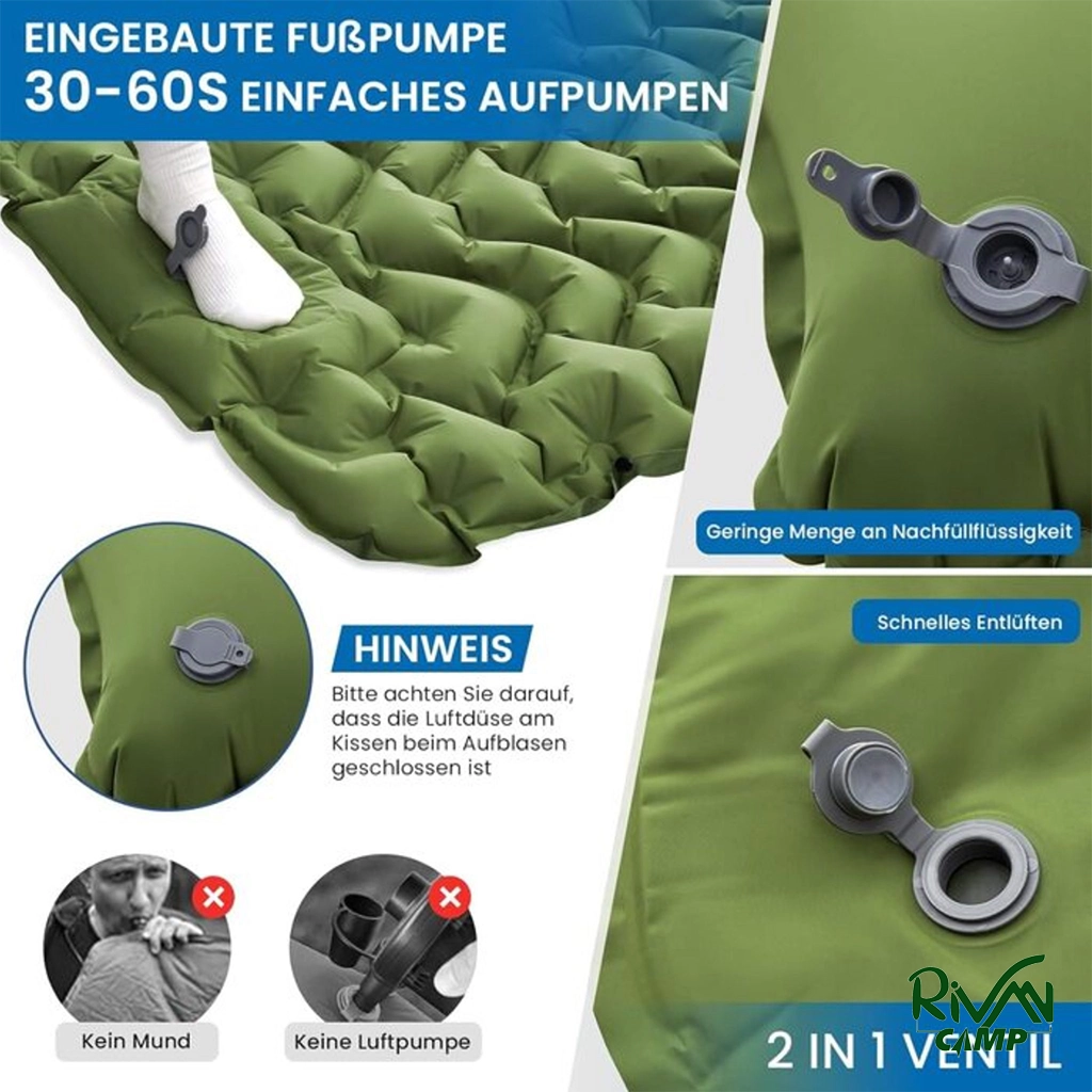 پمپ داخلی کفپا باد کردن زیرانداز را در کمتر از ۹۰ ثانیه امکانپذیر میسازد. دریچه دولایه از نشت هوا جلوگیری و تخلیه سریع را ممکن میکند. دریچه جداگانه در قسمت بالش قابلیت استفاده از پمپ دستی یا دهانی و اتصال چند پد به یکدیگر، استفاده انعطافپذیر و راحت را فراهم میآورد.