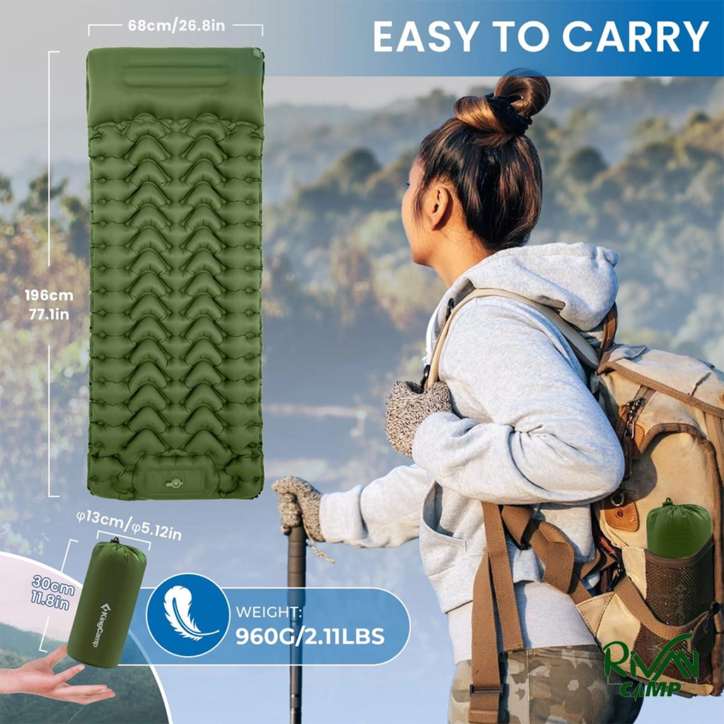 زیرانداز بادی کینگ کمپ مدل KM2401 دارای ابعاد مناسب برای یک نفر است و ضخامت ۶ سانتیمتری آن سطح راحتی کافی برای استراحت فراهم میکند. وزن سبک ۹۰۰ گرمی باعث حمل و جابجایی آسان میشود و پس از جمع شدن فضای کمی در کوله پشتی اشغال میکند. این ویژگیها باعث میشود زیرانداز مناسب سفرهای کوتاه و طبیعتگردی باشد.