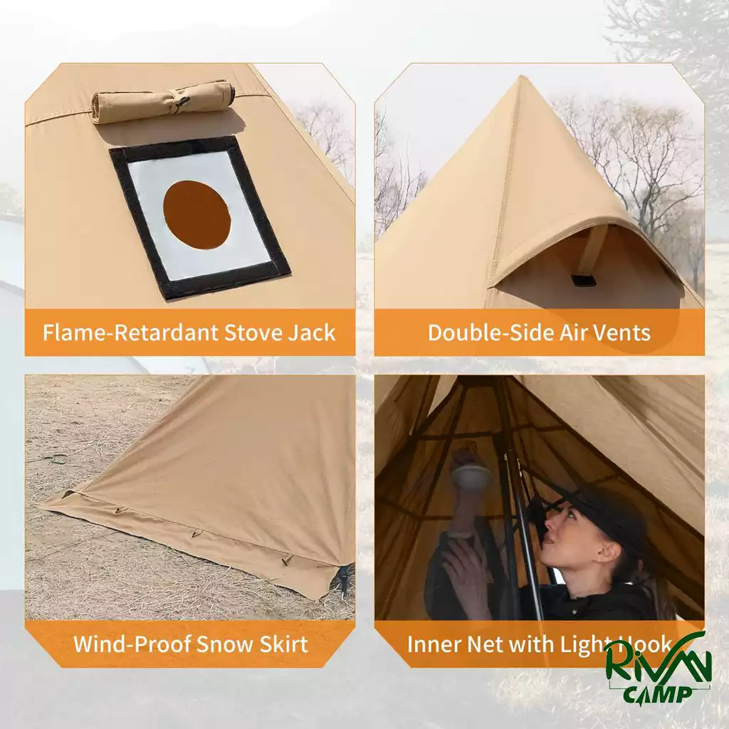 رویه چادر سرخ پوستی کینگ کمپ مدل KHAKI-KT2219 از پارچه 180g T/C 150D آکسفورد ساخته شده که در برابر سایش، پارگی و تغییرات دمایی مقاومت بالایی دارد. این ترکیب متریال برای استفاده در چهار فصل طراحی شده و عملکرد قابل اعتمادی در برابر باد و بارش ارائه میدهد.