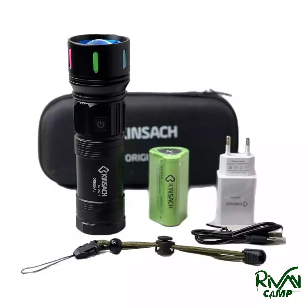 چراغ قوه کینساچ مدل KS‑902‑4 با روشنایی ۳۰۰۰ لومن، برد ۴۰۰ متر، بدنه آلومینیومی مقاوم، باتری لیتیوم یونی ۱۰۰۰۰ میلیآمپر (۲ تا ۴ ساعت شارژدهی)، ۴ رنگ نور (سفید، قرمز، آبی، زرد)، قابلیت پاوربانک، سیستم زوم و ۴ حالت نوردهی، یک گزینه پرقدرت و مطمئن برای استفاده در هر شرایط آبوهوایی است.