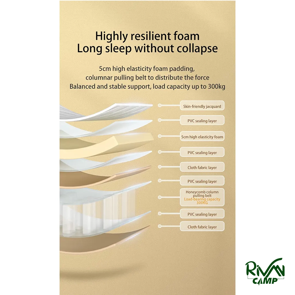 بدنه تشک از PVC چندلایه ساخته شده که استحکام بالا و مقاومت عالی در برابر پارگی، سایش و نفوذ آب دارد. لایه‌ مخملی نرم روی سطح تشک باعث ایجاد حس لطافت و گرمای بیشتر در تماس با پوست می‌شود و تجربه خواب راحت‌تری فراهم می‌کند. این جنس مقاوم، استفاده از تشک را در شرایط چهارفصل ممکن کرده و دوام طولانی‌مدت را تضمین می‌کند.