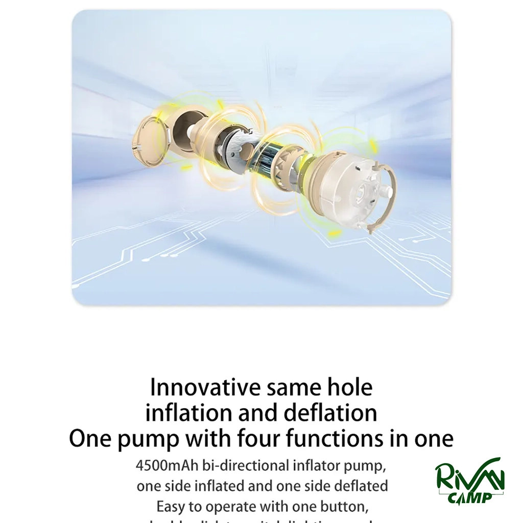 پمپ باد داخلی تشک CNH22DZ026 با ظرفیت باتری ۴۵۰۰ میلی‌آمپر ساعت امکان باد کردن سریع و آسان تشک را بدون نیاز به تجهیزات اضافی فراهم می‌کند. این سیستم خودکار نصب را ساده کرده و در زمان کوتاهی تشک را آماده استفاده می‌کند. همچنین طراحی این پمپ به گونه‌ای است که فشار باد درون تشک حفظ شده و با تحمل وزن بالا بدون کاهش کیفیت، خواب راحتی برای شما به همراه دارد.