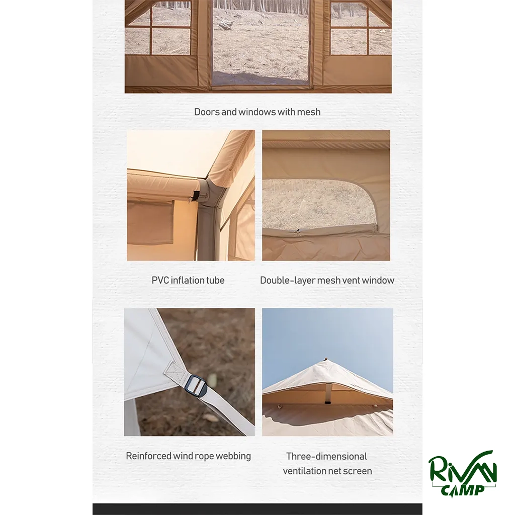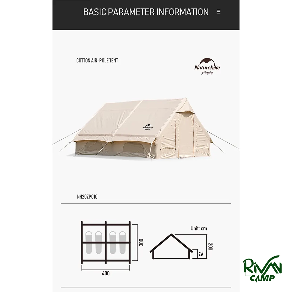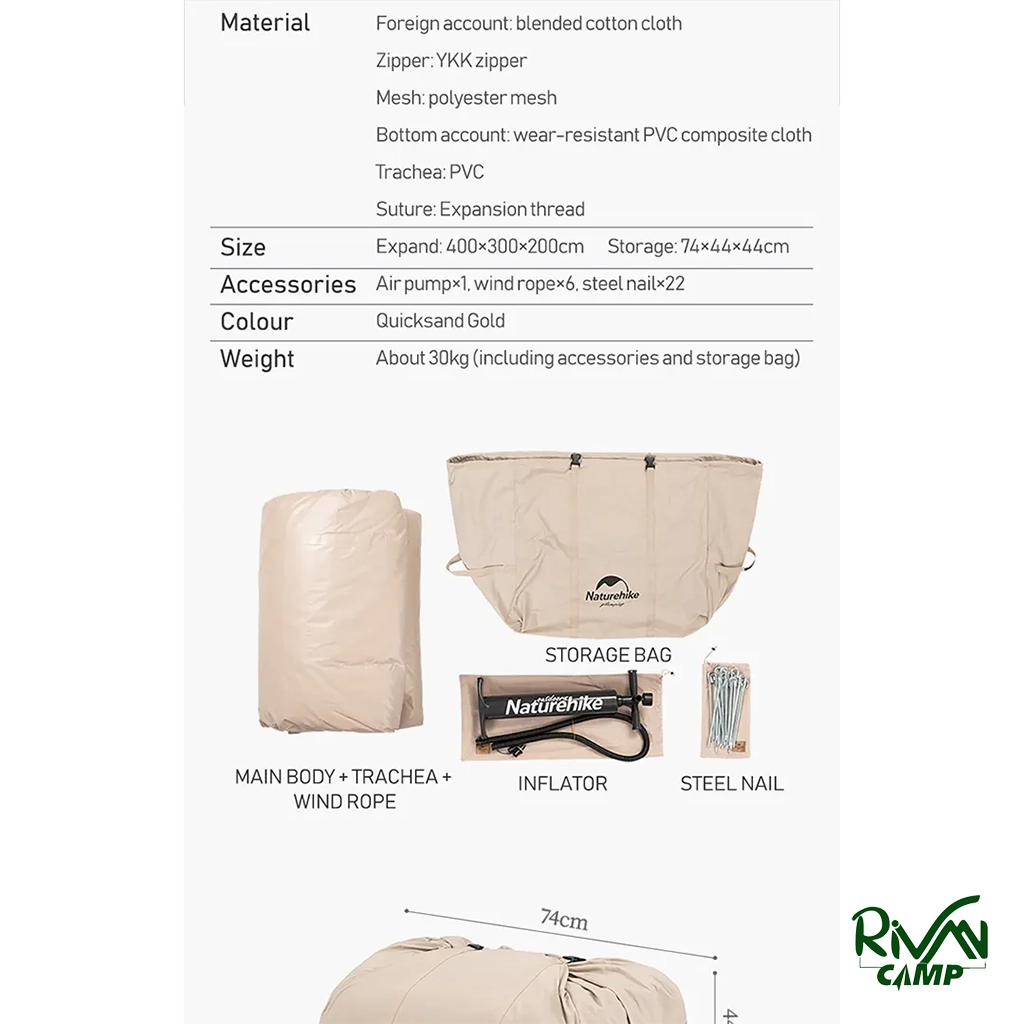 چادر بادی ایر 12.0 نیچرهایک؛ ظرفیت ۴ تا ۶ نفر، مساحت ۱۲ متر مربع، جنس پلیاستر ۶۰۰D با روکش PVC، ضدآب با مقاومت ۱۵۰۰ تا ۲۰۰۰ میلیمتر، طراحی چهار فصل، وزن حدود ۳۰ کیلوگرم، ستونهای بادی و نصب سریع.