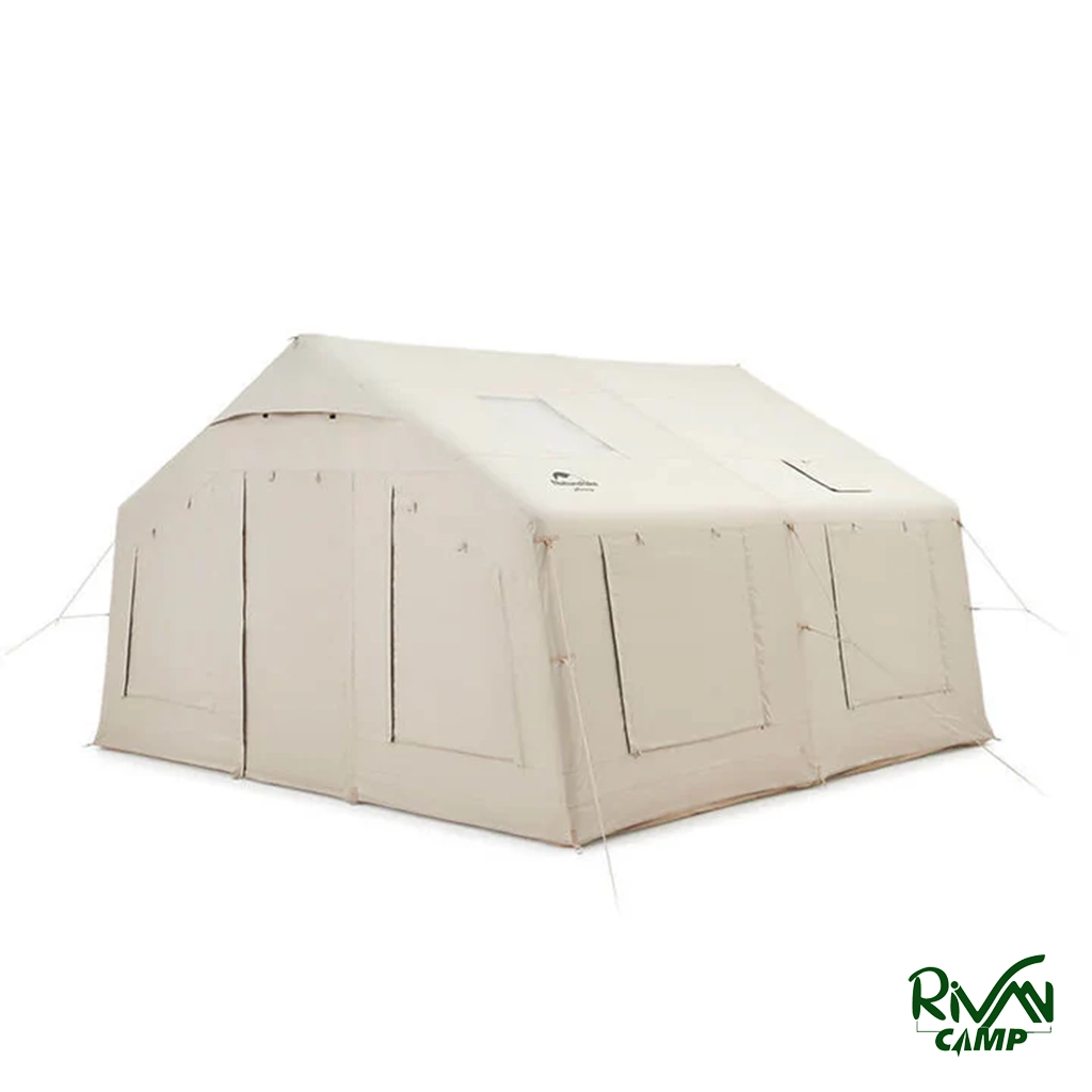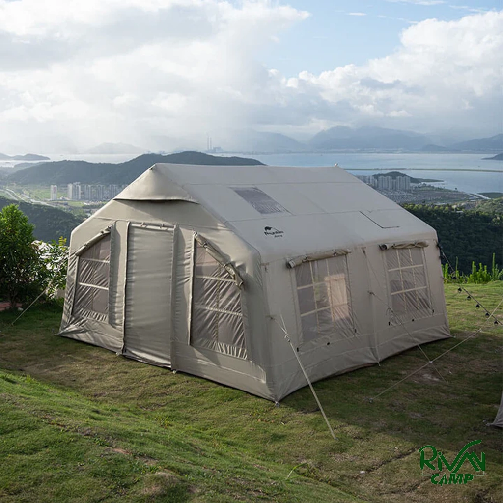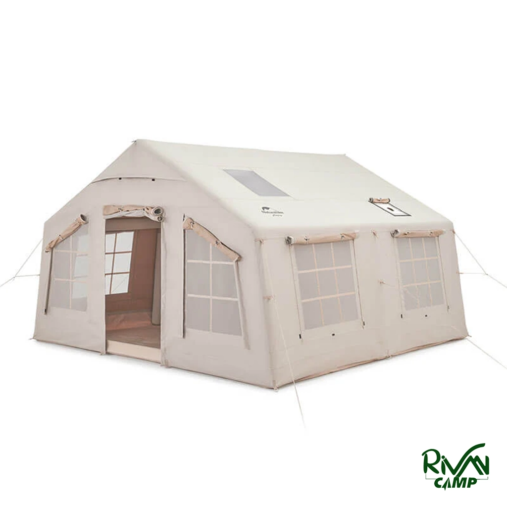 چادر بادی نیچرهایک مدل NH22ZP014، ظرفیت 3 تا 4 نفر، بدنه پلیاستر 600D، ستون پیویسی، کف مشبک، همراه با پمپ و لوازم جانبی، ابعاد 360x360x220 سانتیمتر، کیف حمل بزرگ.