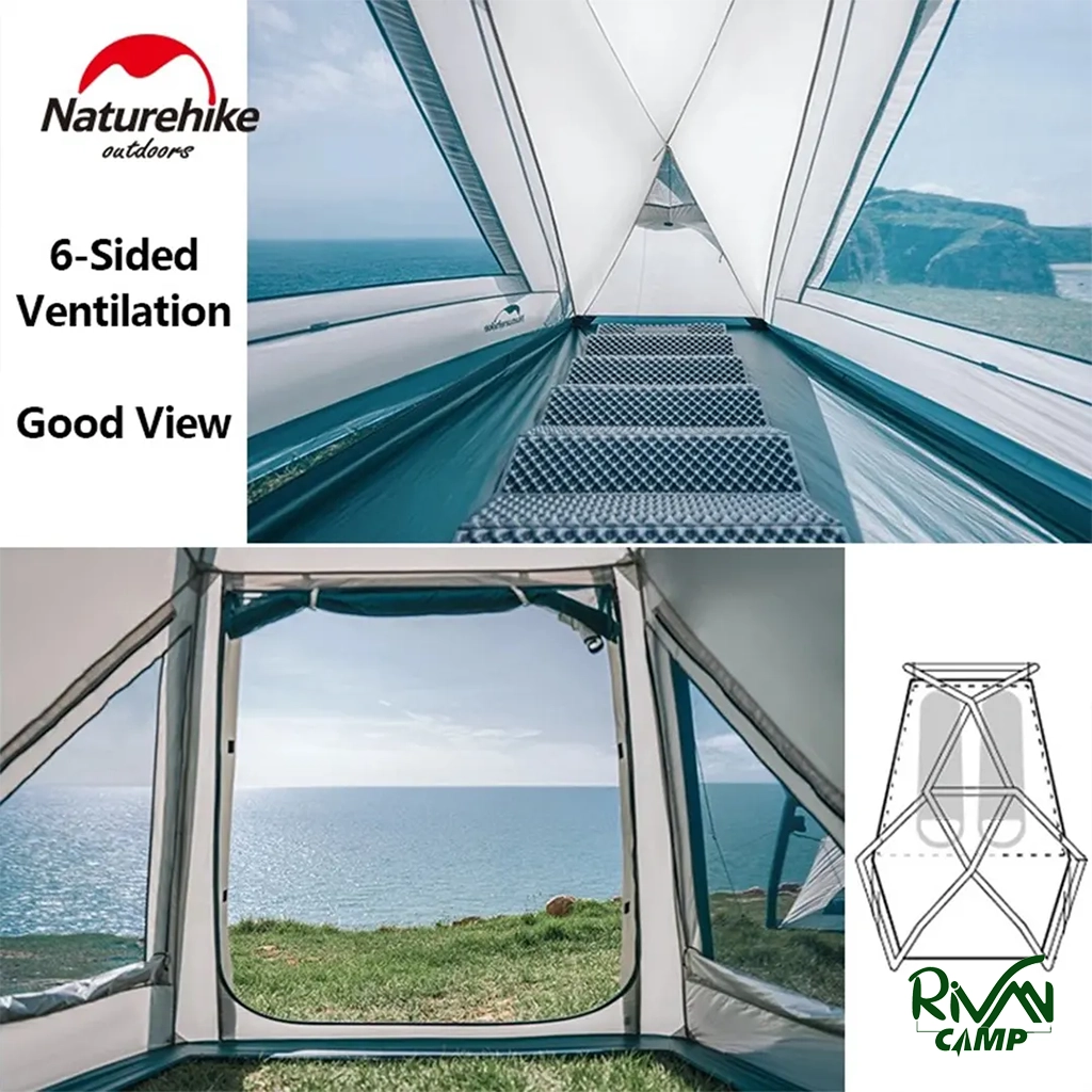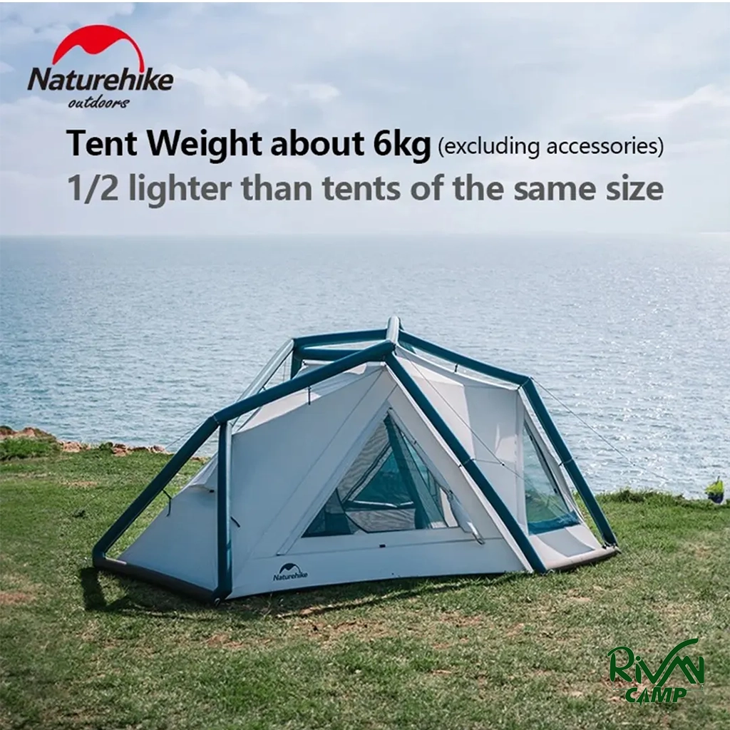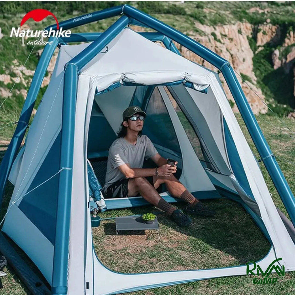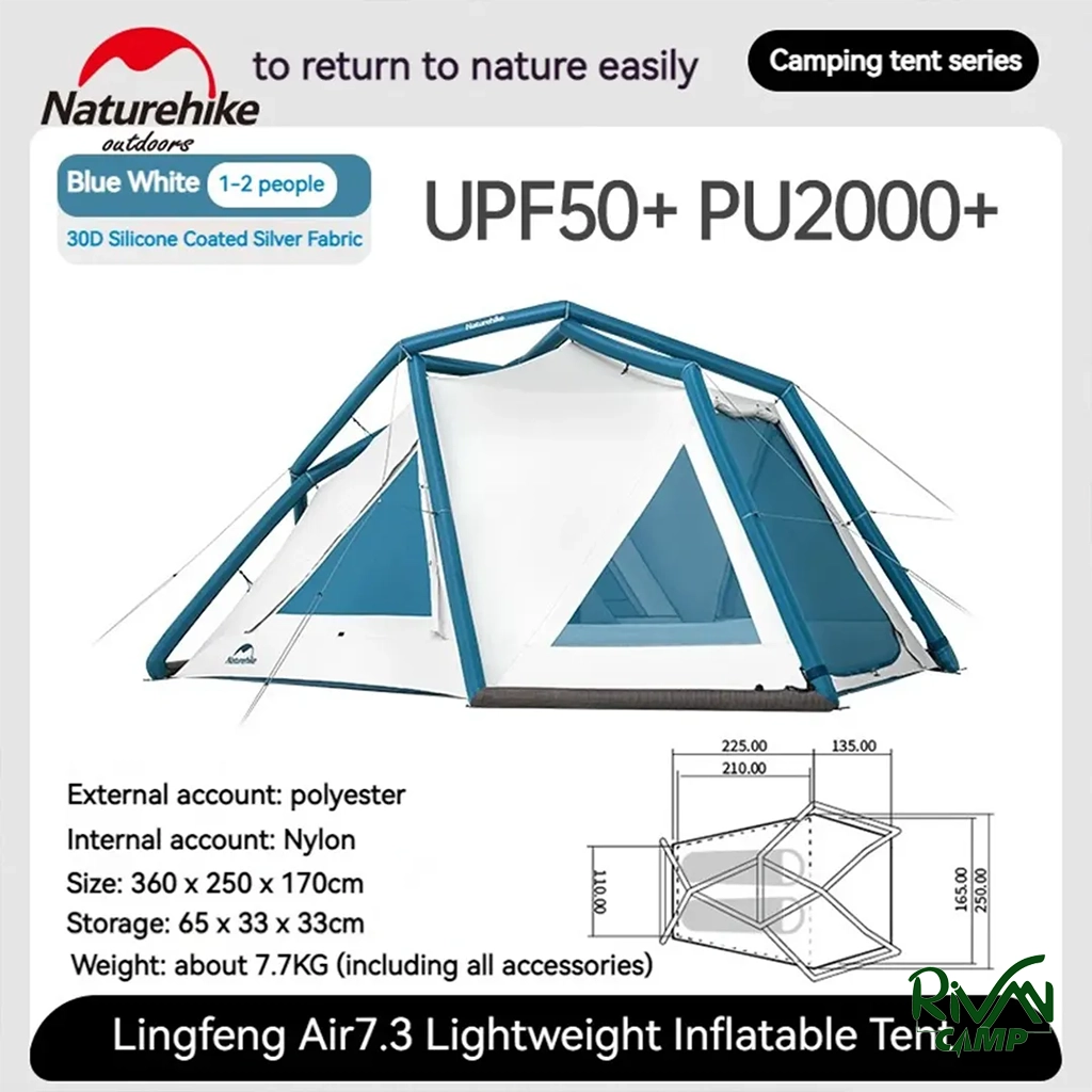 چادر بادی ایر 7.3 نیچرهایک مدل CNK2300ZP012 ابعاد 360×250×170 سانتیمتر، ظرفیت 2 تا 3 نفر، جنس پلیاستر سیلیسی روکشدار و نایلون، ضد آفتاب UPF50، وزن حدود 7.7 کیلوگرم، همراه با پمپ، میخ، طناب و کیسه ذخیرهسازی.
