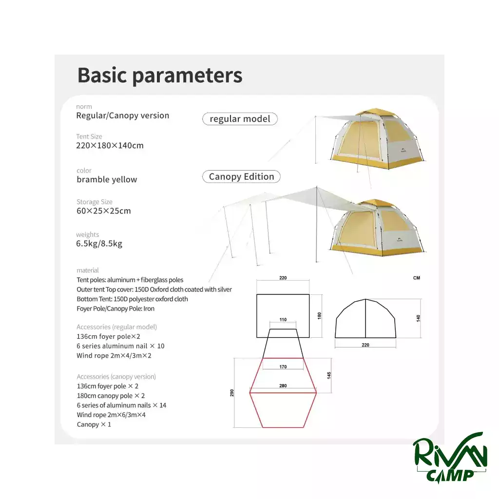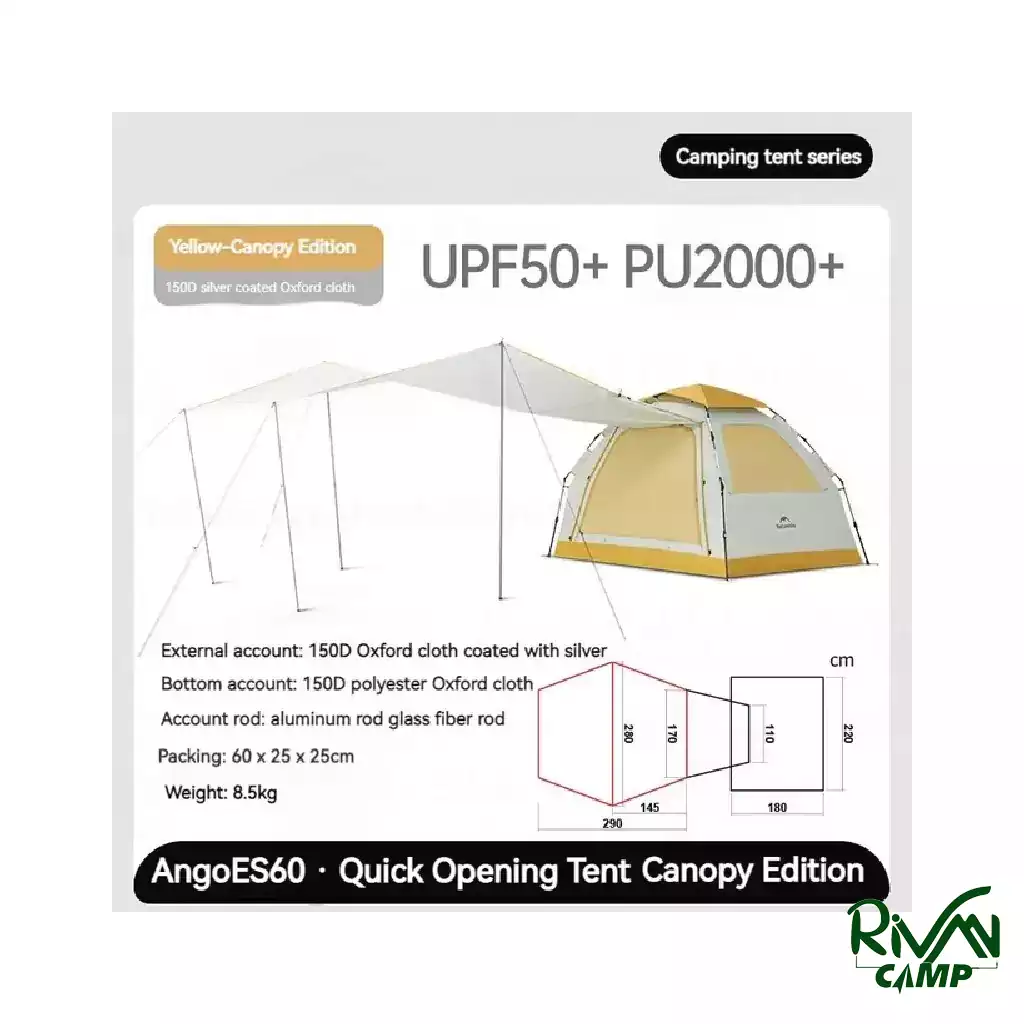 اگر به دنبال یک چادر خانوادگی هستید که هم راحتی و هم فضای کافی را در دل طبیعت برای شما فراهم کند، چادر اتوماتیک نیچرهایک Ango ES60 مدل CNK230WS018 جزو بهترین انتخاب‌های شما خواهد بود. این چادر با ابعاد داخلی ۱۴۰ × ۱۸۰ × ۲۲۰ سانتی‌متر برای ۴ نفر طراحی شده و با افزودن ایوان جلویی و اتصال به سایبان، ظرفیت آن به ۶ نفر افزایش می‌یابد. وزن مناسب (حدود ۶.۵ کیلوگرم و نسخه ارتقا یافته ۸.۵ کیلوگرم) در کنار طراحی نیمه‌خودکار، آن را به انتخابی عالی برای کمپینگ خانوادگی و سفرهای چندروزه تبدیل کرده است. جنس پارچه از آکسفورد 150D با روکش نقره‌ای و کف از آکسفورد پلی‌استر ضدآب ساخته شده تا در برابر باران و رطوبت محافظت کامل داشته باشد.