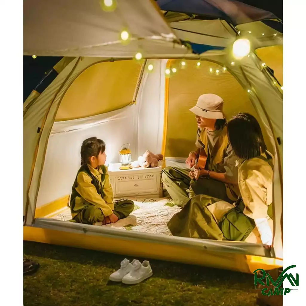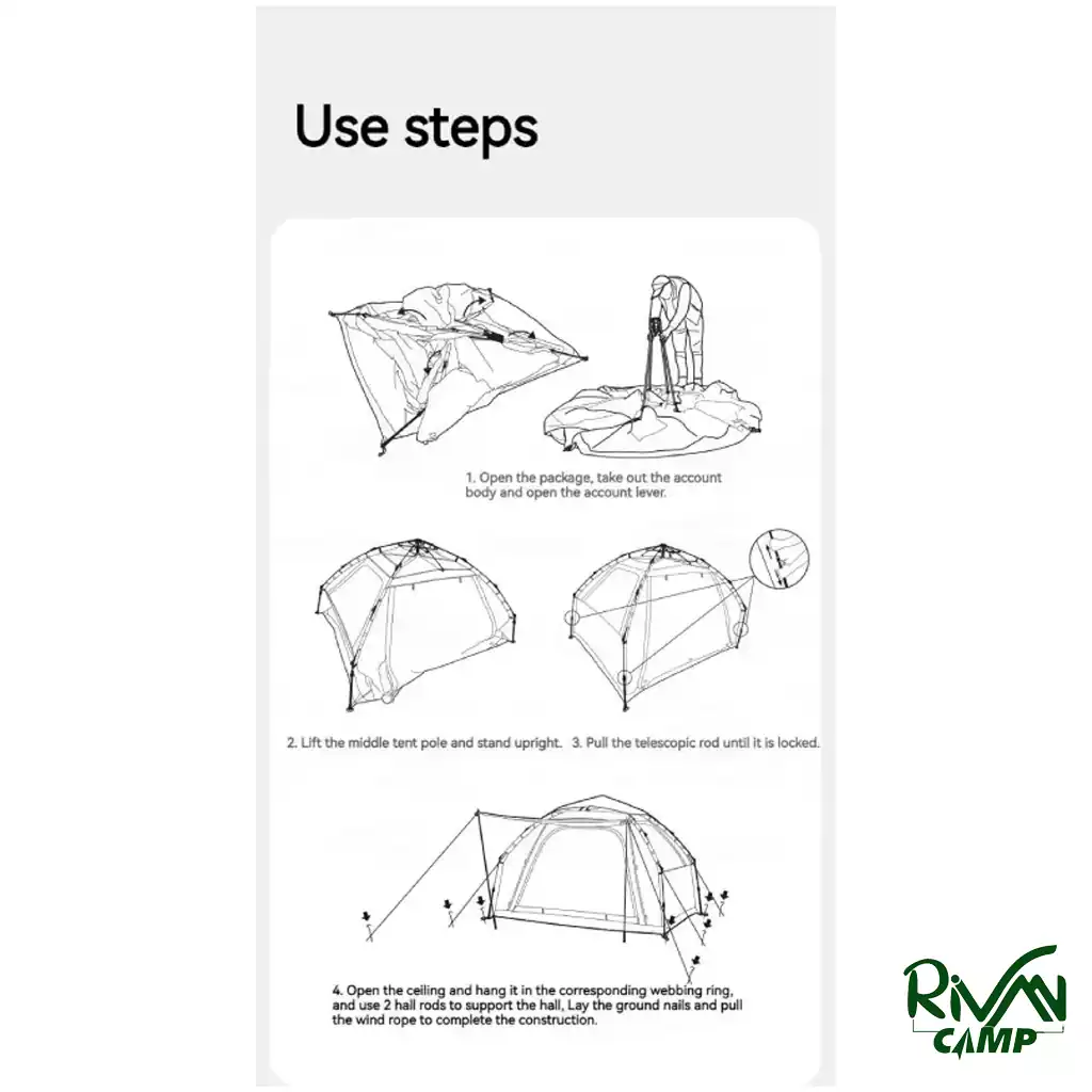 استفاده از پارچه آکسفورد 150D با روکش نقره‌ای در بدنه و آکسفورد پلی‌استر ضدآب در کف، مقاومت بالایی در برابر رطوبت و باران ایجاد می‌کند. این ترکیب به شما اطمینان می‌دهد که در شرایط آب ‌و هوایی مرطوب یا بارانی، وسایل و افراد داخل چادر خشک و ایمن باقی می‌مانند. فریم فایبرگلاس و میله‌های آلومینیومی نیز ثبات و استحکام لازم را حتی در برابر وزش بادهای شدید تضمین می‌کنند.