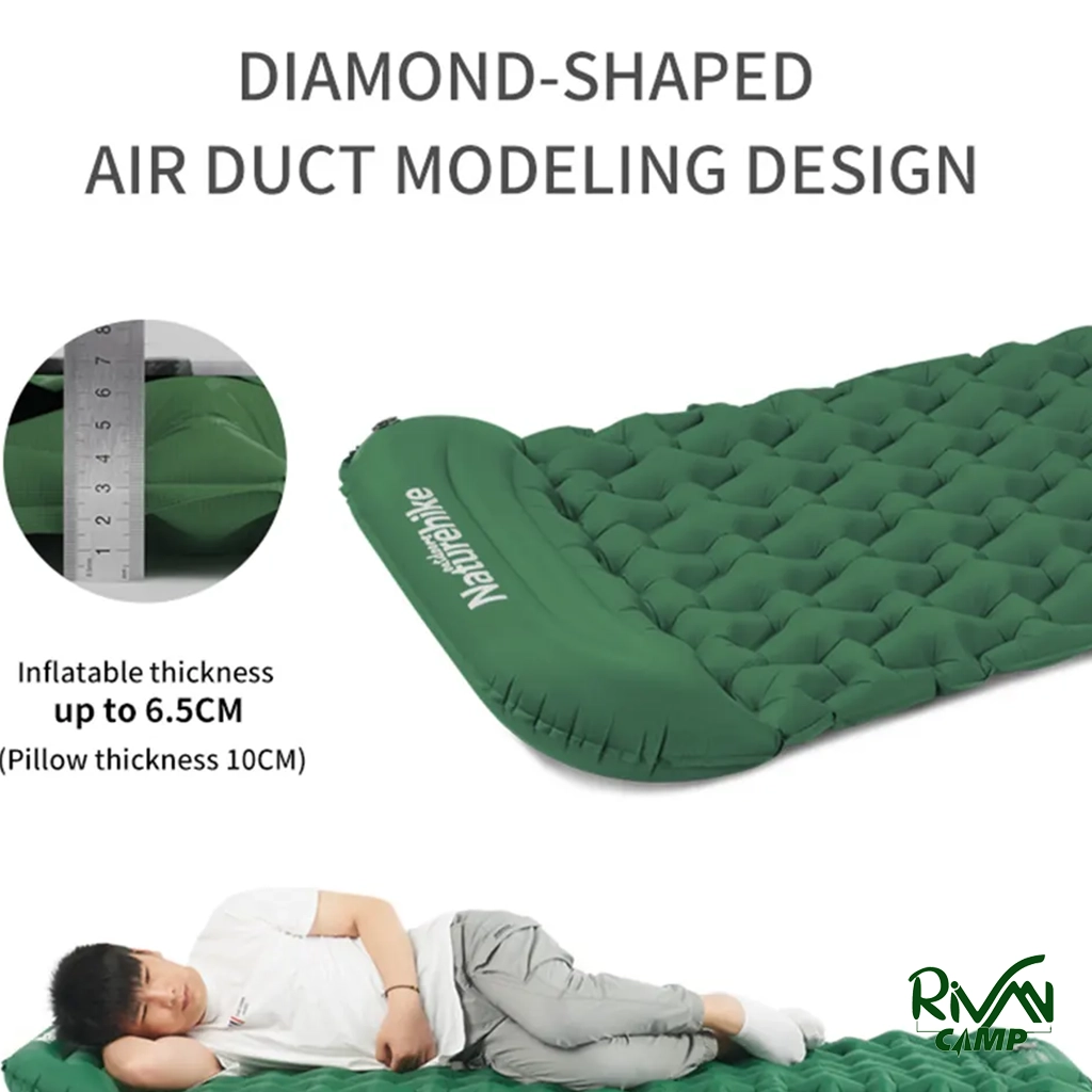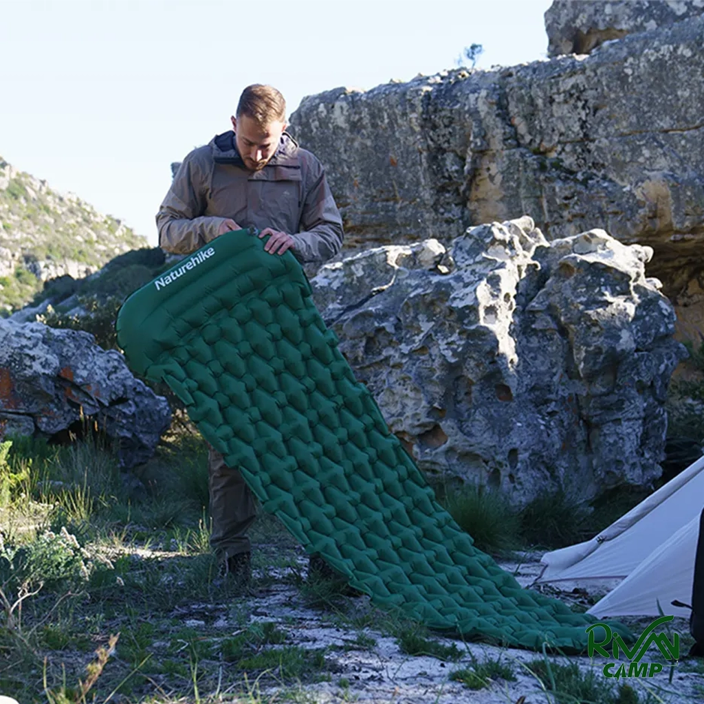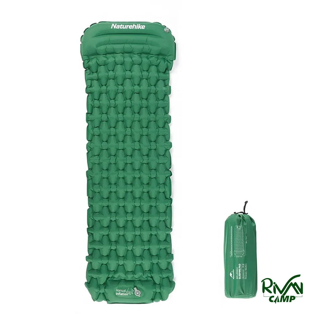 زیرانداز بادی کیسه خواب نیچرهایک مدل FC12 CNK2300DZ0001، دارای طراحی سلول‌های هوای الماسی، جنس نایلون با روکش TPU، پمپ فشاری داخلی، بالش یکپارچه، سبک و جمع‌وجور، مناسب برای کمپینگ و سفرهای طبیعت‌گردی.