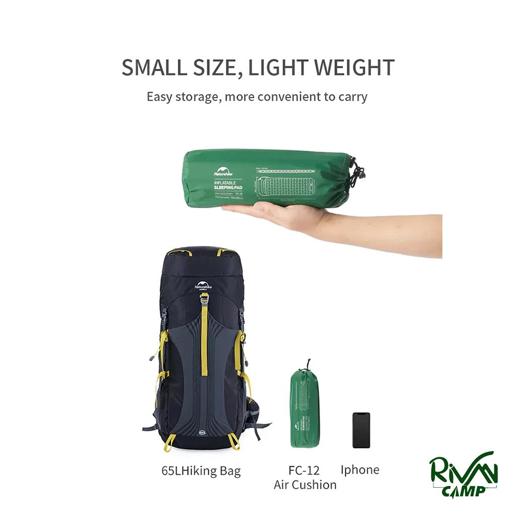 زیرانداز نیچرهایک مدل FC12 CNK2300DZ0001 در حالت باز اندازه‌ای برابر با ۱۹۸ در ۵۹ سانتی‌متر دارد و با ضخامت ۶.۵ سانتی‌متر، راحتی را برای شما به همراه دارد. در حالت جمع‌شده تنها ۳۰ در ۱۰ سانتی‌متر حجم دارد و حمل آن بسیار آسان است. وجود پمپ باد فشاری داخلی باعث می‌شود نیازی به پمپ جداگانه نباشد و در زمان کوتاهی آماده استفاده شود.