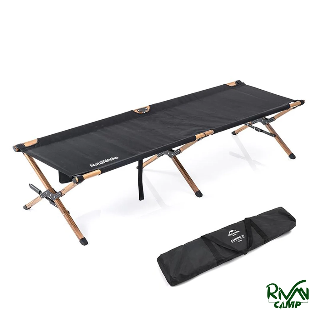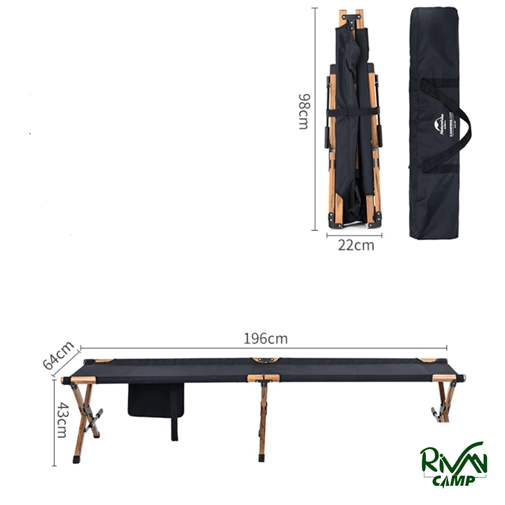 تخت تاشو XJC03 نیچرهایک مدل NH19X003-C با ابعاد باز ۱۹۶×۶۴×۴۳ سانتی‌متر، ابعاد بسته ۹۸×۲۲ سانتی‌متر، وزن ۶ کیلوگرم، اسکلت آلومینیومی با ظاهر چوب، پارچه نایلون ۳۰۰D مقاوم، تحمل وزن ۱۵۰ کیلوگرم، پایه‌های ۲.۵ سانتی‌متر، جیب جانبی و کیف حمل، رنگ‌بندی مشکی و خاکی، مناسب کمپینگ و آفرود.