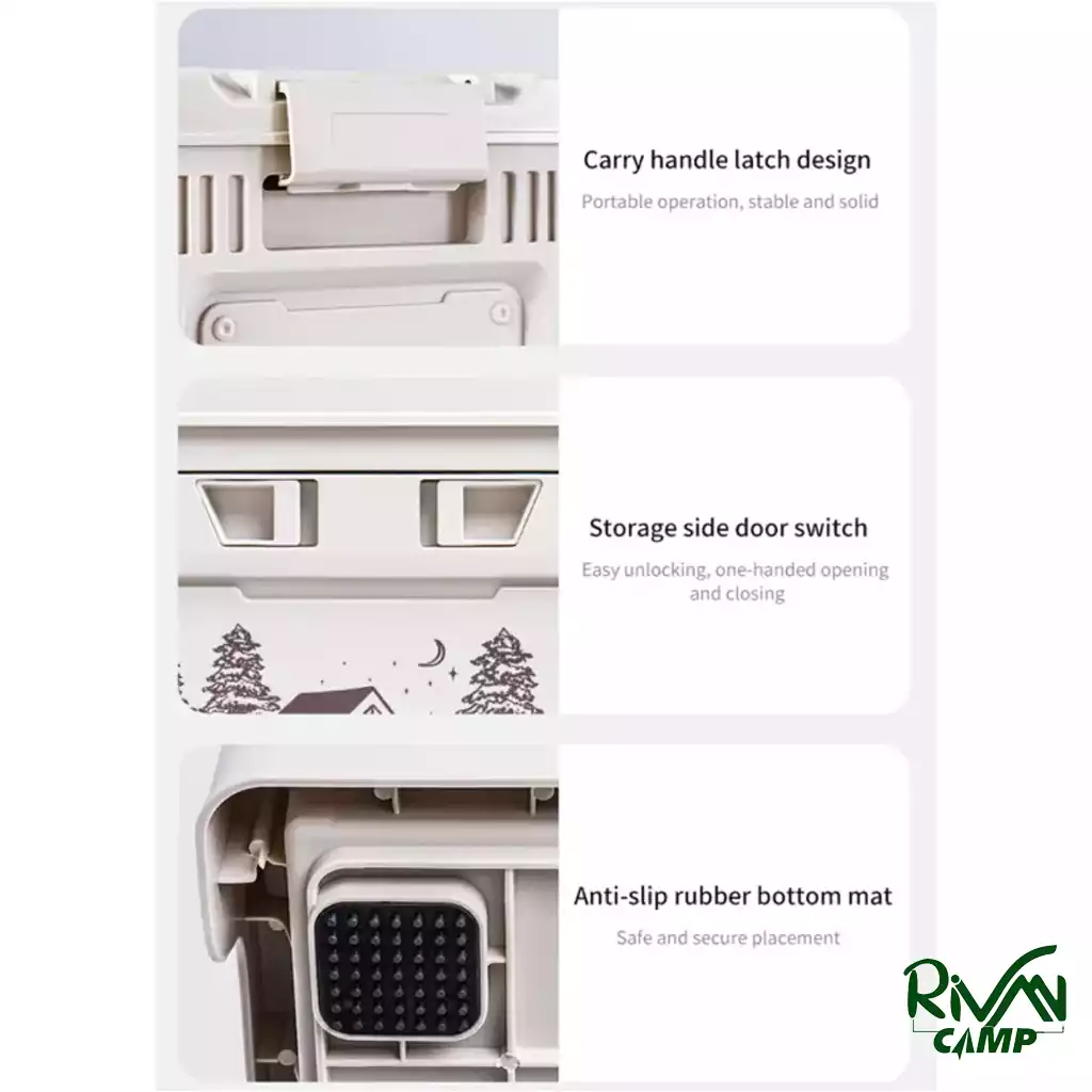 همچنین وجود کیسه حمل و طراحی مناسب ابعاد، جابهجایی آن را سادهتر کرده است. چه در صندوق عقب خودرو، چه در انبار منزل یا داخل چادر کمپینگ، این باکس بهراحتی جای میگیرد و به شما کمک میکند وسایل را مرتب، ایمن و در دسترس نگه دارید.