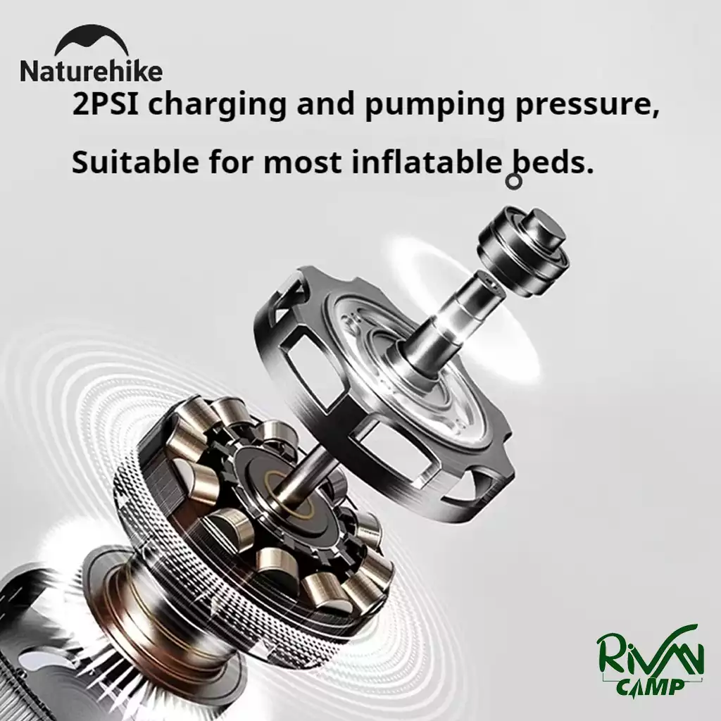 پمپ بادی نیچرهایک مدل CNK2450ZM017 دارای 120 وات توان و فشار 2PSI است که قدرت کافی برای باد کردن تشک، قایق و سایر تجهیزات بادی را دارد.