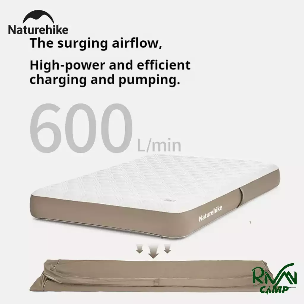 یکی از مهمترین ویژگیهای پمپ بادی نیچرهایک مدل CNK2450ZM017، جریان هوای 600 لیتر در دقیقه است. این میزان جریان نشاندهنده سرعت بالای دستگاه در پر کردن حجمهای بزرگ مانند تشکهای بادی یا قایقهای کوچک است. شما میتوانید این تجهیزات را در چند دقیقه (حدود 2 دقیقه) برای استفاده آماده کنید.