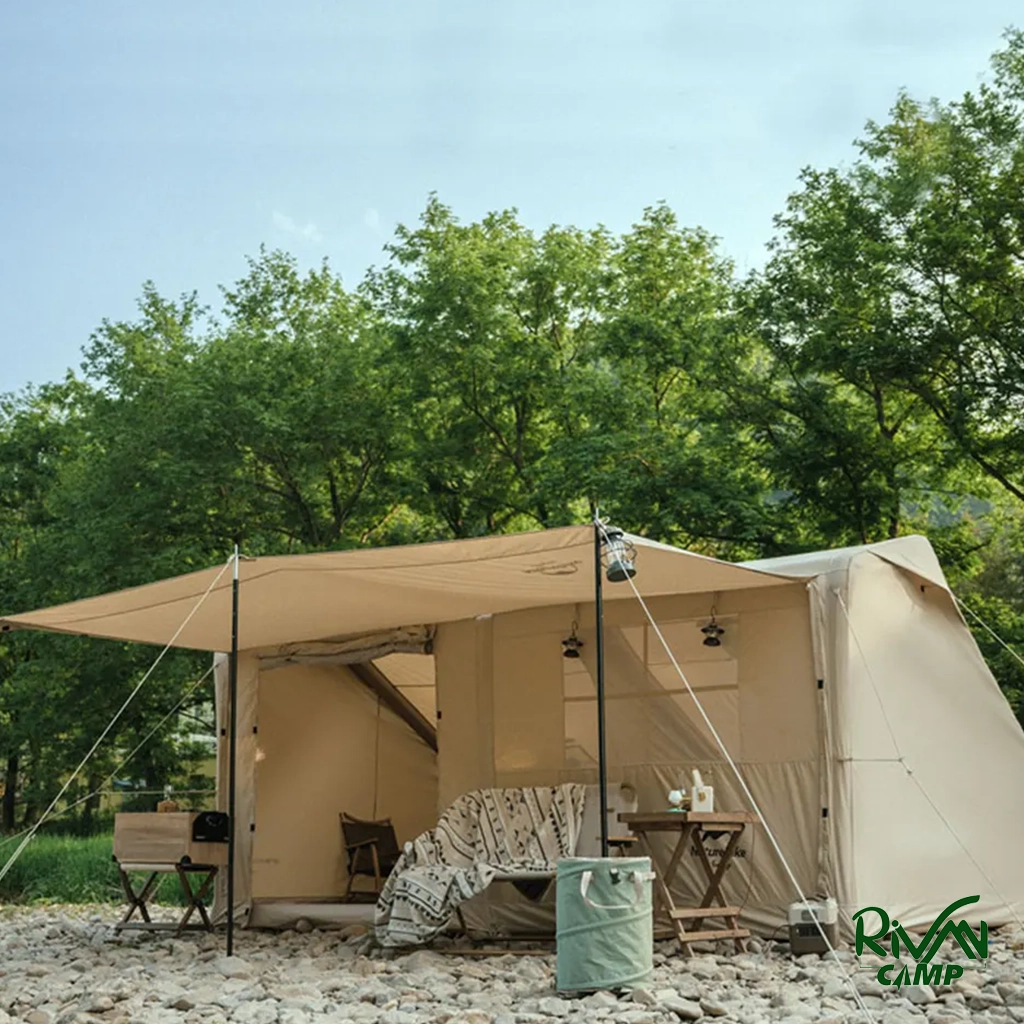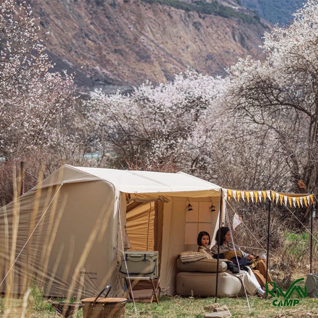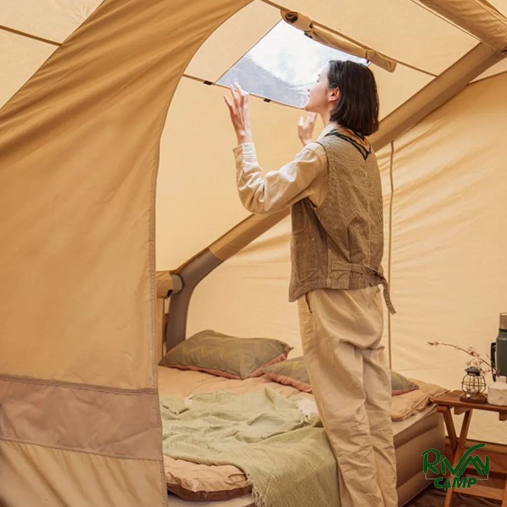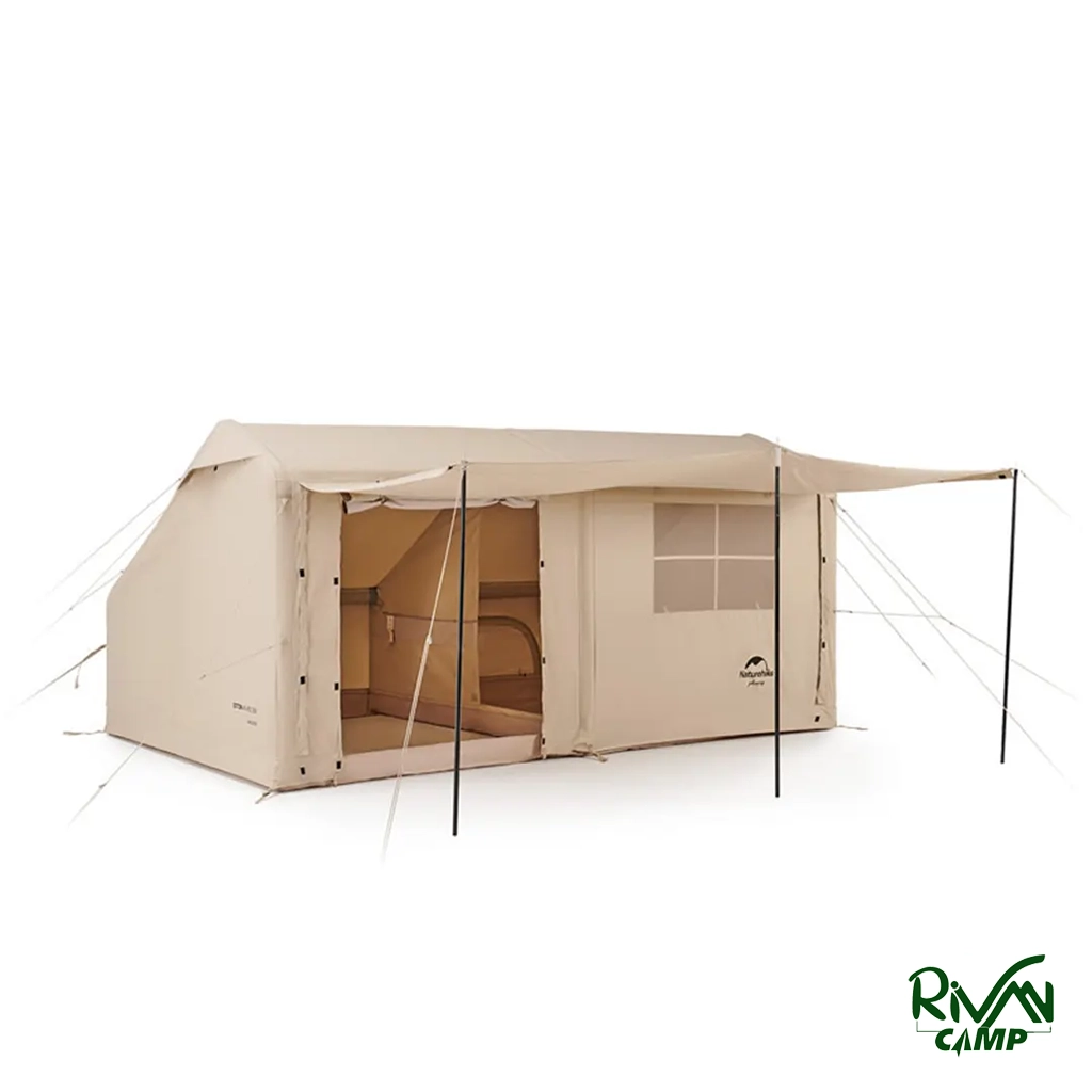چادر بادی نیچرهایک NH22ZP013، ابعاد جادار 410×270×200 سانتی‌متر، ظرفیت 2 تا 4 نفر، پارچه ترکیب پنبه مقاوم، ستون‌های TPU، زیپ YKK، بالکن با سایه‌بان سه متری، سقف شفاف، تهویه PVC، پمپ باد دستی.