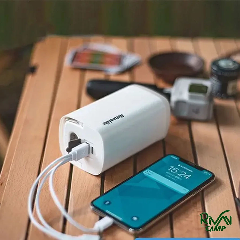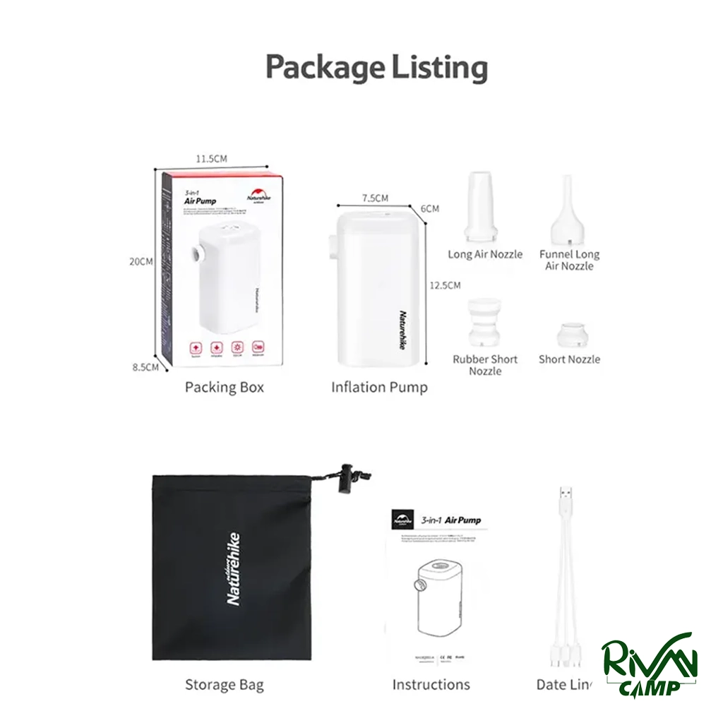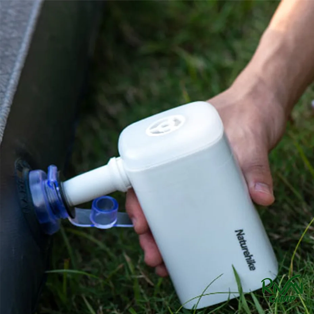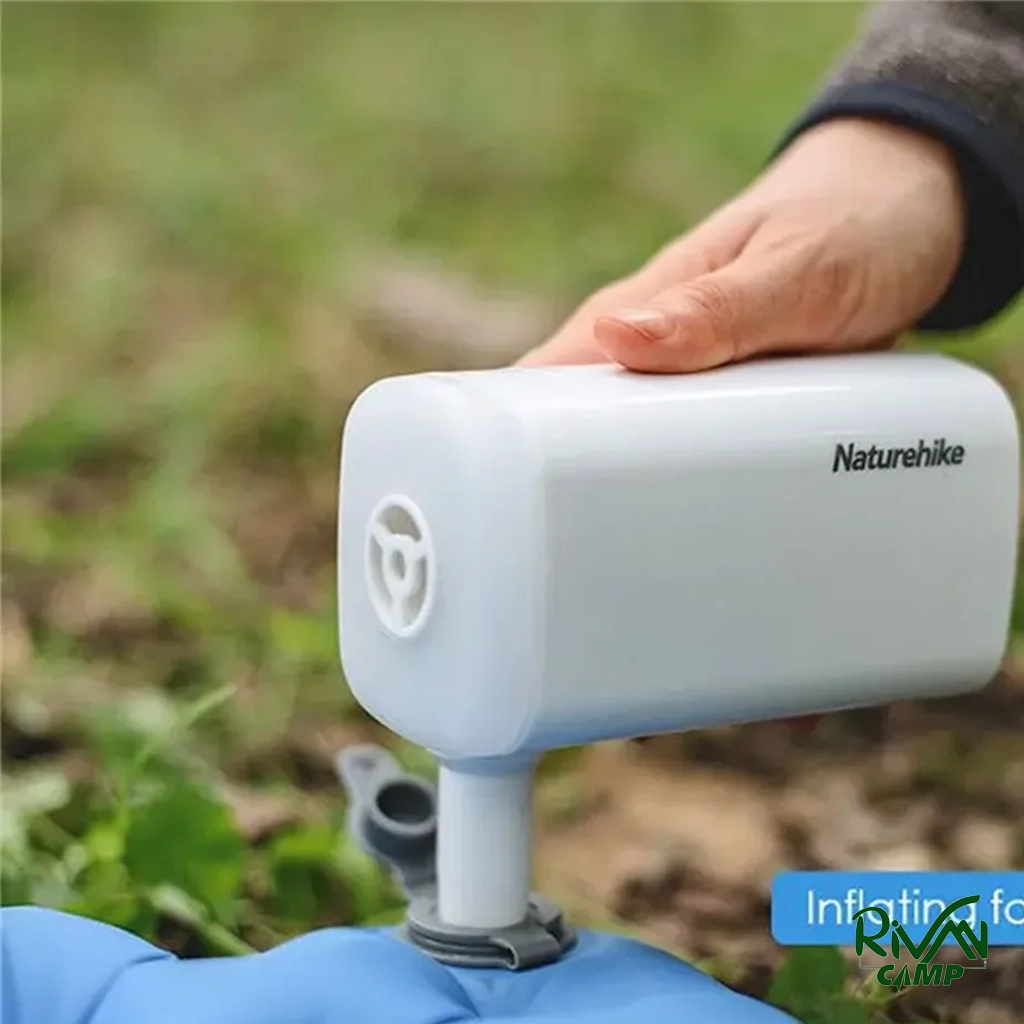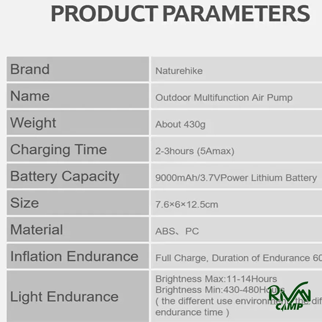 پمپ باد شارژی چند منظوره نیچرهایک مدل NH18Q001-A با بدنه مقاوم ABS و PC، وزن 430 گرم، ابعاد جمعوجور، باتری 9000 میلیآمپر ساعت، چراغ LED 350 لومن، چهار سری باد، دو آداپتور، ضد آب، مناسب کمپینگ.