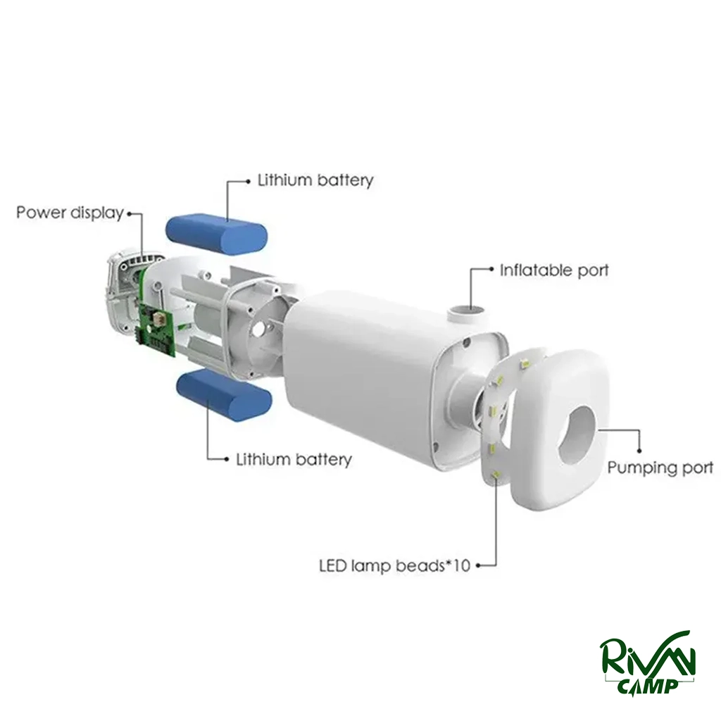 این پمپ قابلیت کارکرد به عنوان پمپ باد، پاوربانک و چراغ LED را دارد. باتری 9000 میلیآمپر ساعتی امکان استفاده طولانی مدت و شارژدهی مناسب را فراهم میکند. چراغ LED با روشنایی 350 لومن و مدت زمان نوردهی 11 تا 480 ساعت شرایط مناسب برای کمپینگ و شبمانی ایجاد میکند.