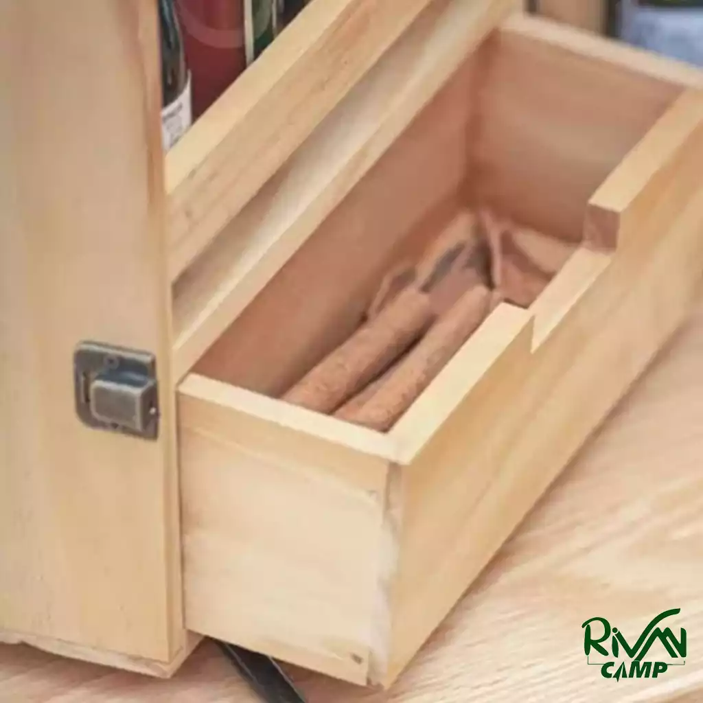 طراحی چندلایه این جاادویه باعث میشود بتوانید ادویهها، چاشنیها و حتی ابزارهای کوچک آشپزی را به صورت تفکیکشده نگهداری کنید. دو طبقه مجزا فضای اصلی را تشکیل میدهند و کشوی داخلی نیز برای قرار دادن اقلام کوچکتر مانند قاشق ادویه، فندک یا چاقوی کوچک کاربرد دارد. این ساختار به شما کمک میکند بدون بههمریختگی، سریع به وسایل مورد نیاز دسترسی داشته باشید.