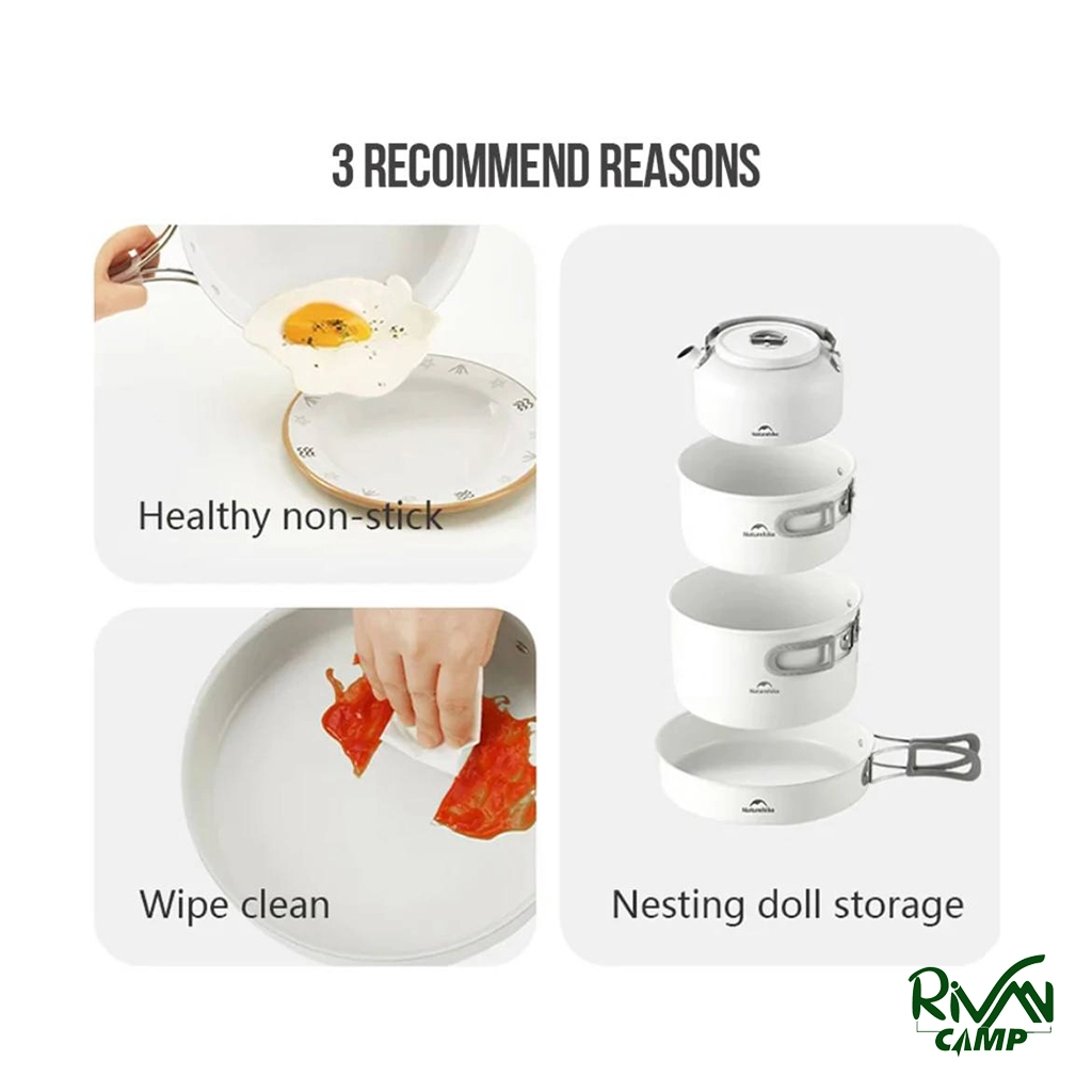 این ست شامل دو قابلمه در اندازههای مختلف، یک ماهیتابه و یک کتری است که مجموعهای کامل برای پختوپز در سفر فراهم میسازد. وجود چند سایز قابلمه باعث میشود بتوان انواع غذاها را متناسب با نیاز آماده کرد. ماهیتابه برای سرخ کردن و کتری برای جوشاندن آب یا تهیه نوشیدنیهای گرم کاربرد دارد. ترکیب این اقلام در یک مجموعه باعث میشود کاربر همه نیازهای پختوپز را با خود بهسادگی همراه داشته باشد.