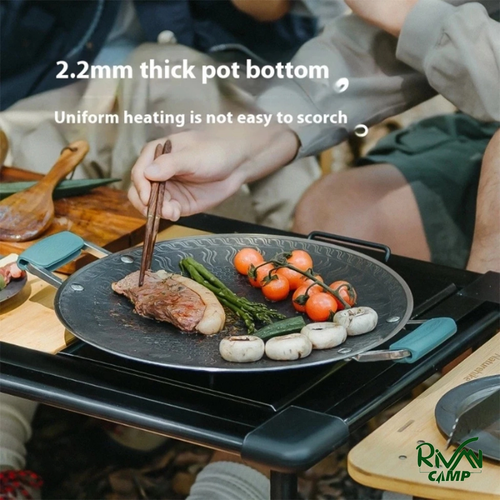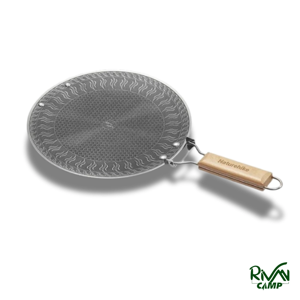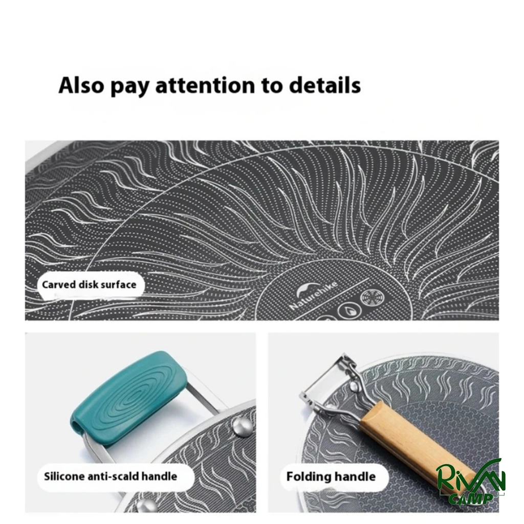 ماهیتابه استیل ضدزنگ (لویان) نیچرهایک مدل CNK2550CF011، ساخته‌شده از استیل ضدزنگ 316، سطح لانه‌زنبوری ضدچسب، دسته چوبی مقاوم، طراحی تاشو قابل حمل، مناسب برای پخت در سفر و کمپینگ.