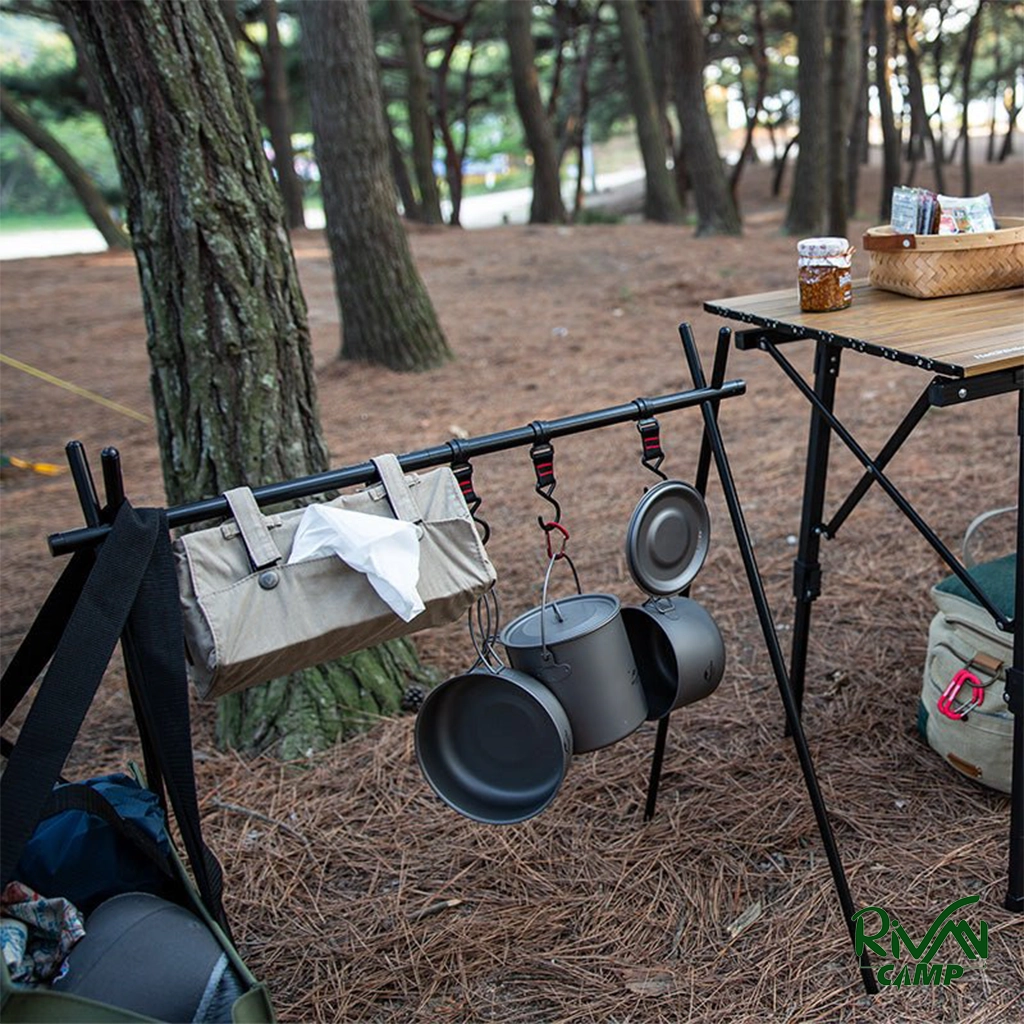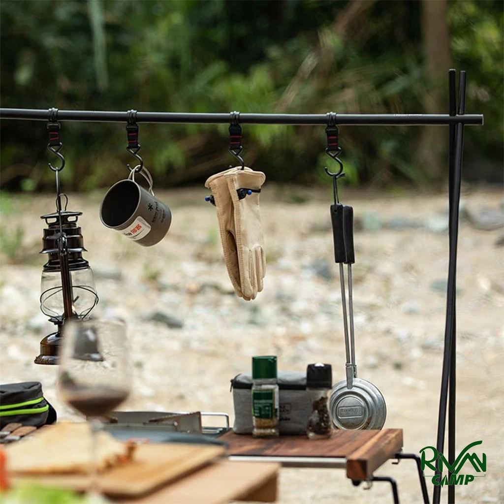 هر پایه قفسه دارای قلابهایی است که میتوانید وسایل مختلف مثل ظروف آشپزی، چراغ قوه، حوله یا لباس را از آنها آویزان کنید. این ویژگی کمک میکند فضای اطراف شما همیشه مرتب و تمیز بماند. علاوه بر این، فریم افقی قفسه هم برای خشک کردن لباس در سفرهای طولانی بسیار کارآمد است.