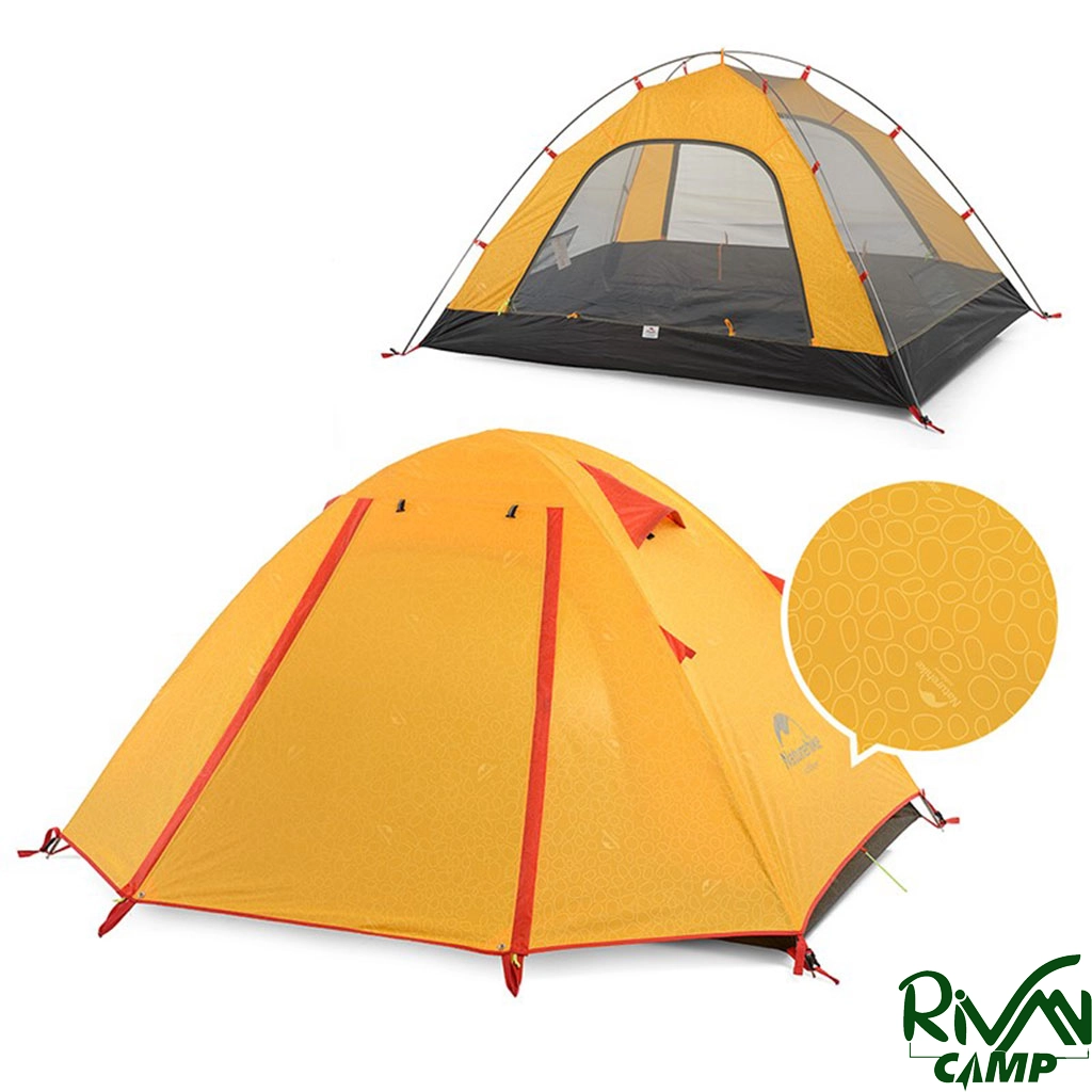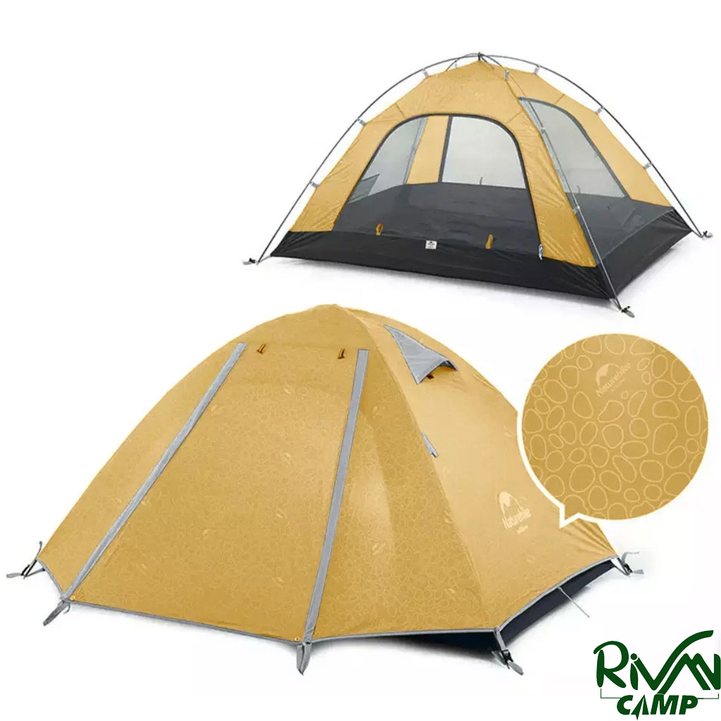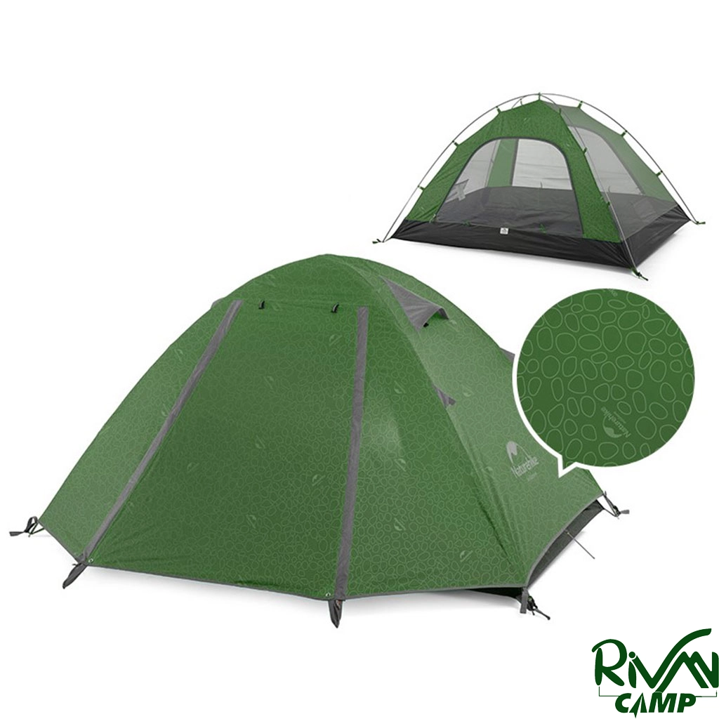 چادر دو نفره نیچرهایک مدل NH18Z022-P پارچه پلیاستر 210T و زیره از پلیاستر 150D مجهز به پوشش ضد آب PU3000mm با تیرکهای آلومینیومی و دارای دو پوش، هواکش، آفتابگیر و پشهبند است.
