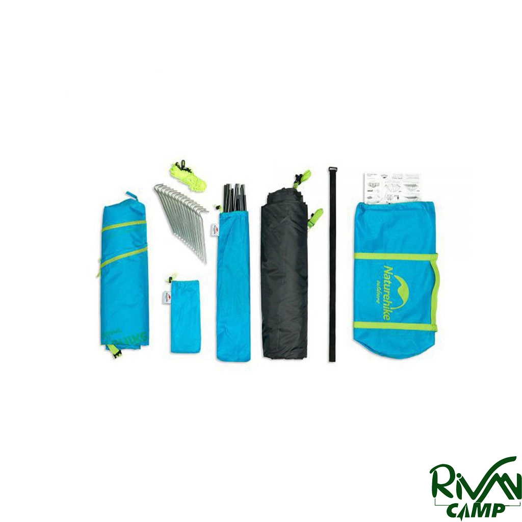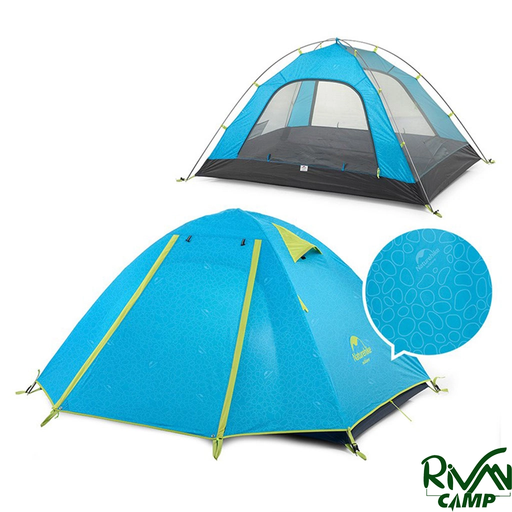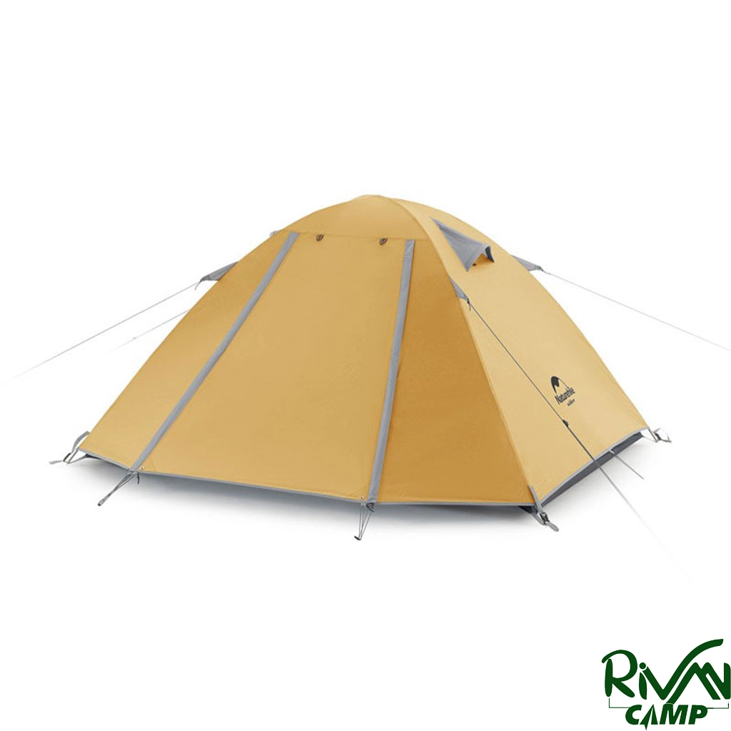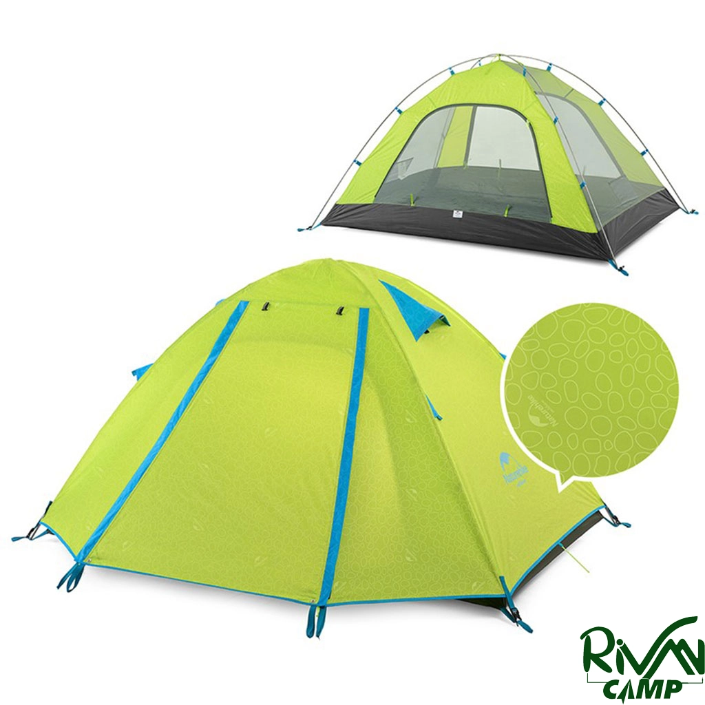 چادر دو نفره نیچرهایک مدل NH18Z022-P پارچه پلیاستر 210T و زیره از پلیاستر 150D مجهز به پوشش ضد آب PU3000mm با تیرکهای آلومینیومی و دارای دو پوش، هواکش، آفتابگیر و پشهبند است.