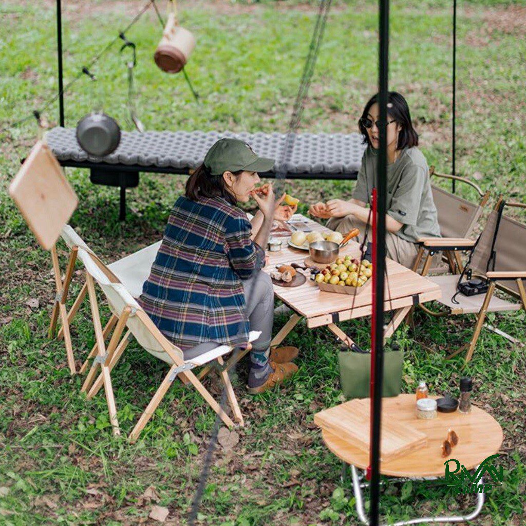طرح چوب روشن سطح میز، علاوه بر ظاهر زیبا، حس طبیعیتری ایجاد میکند. این ویژگی برای افرادی که به هماهنگی تجهیزات کمپینگ اهمیت میدهند جذاب است و در عین حال سطحی صاف و کاربردی برای قرار دادن وسایل فراهم میکند.