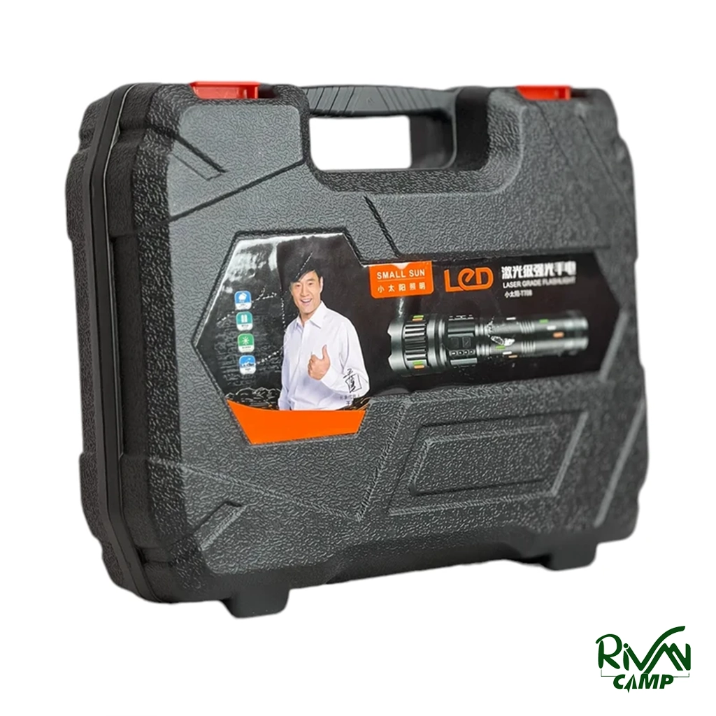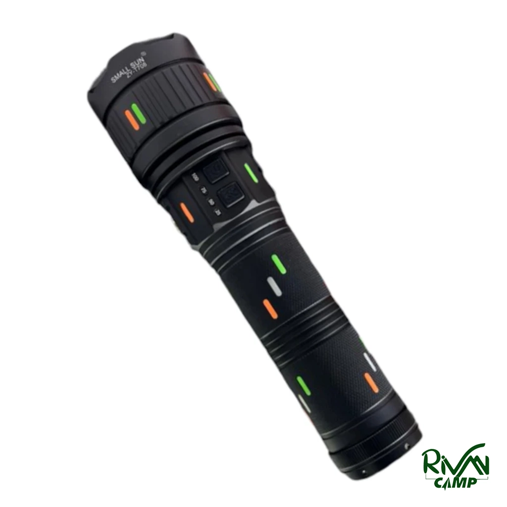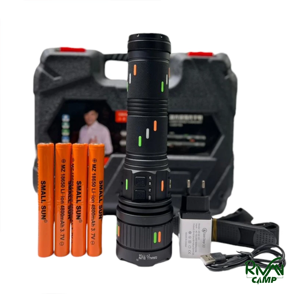 چراغ قوه اسمال سان مدل ZY-T708 دارای بدنه آلومینیومی مقاوم، نور سفید یخی با برد ۷۰۰ متر، چهار حالت نوردهی، قابلیت زوم، چراغ چشمک زن، لامپ LED LASER، انرژی از ۴ باتری ۴۸۰۰ میلیآمپر، مقاوم در برابر آب و ضربه.