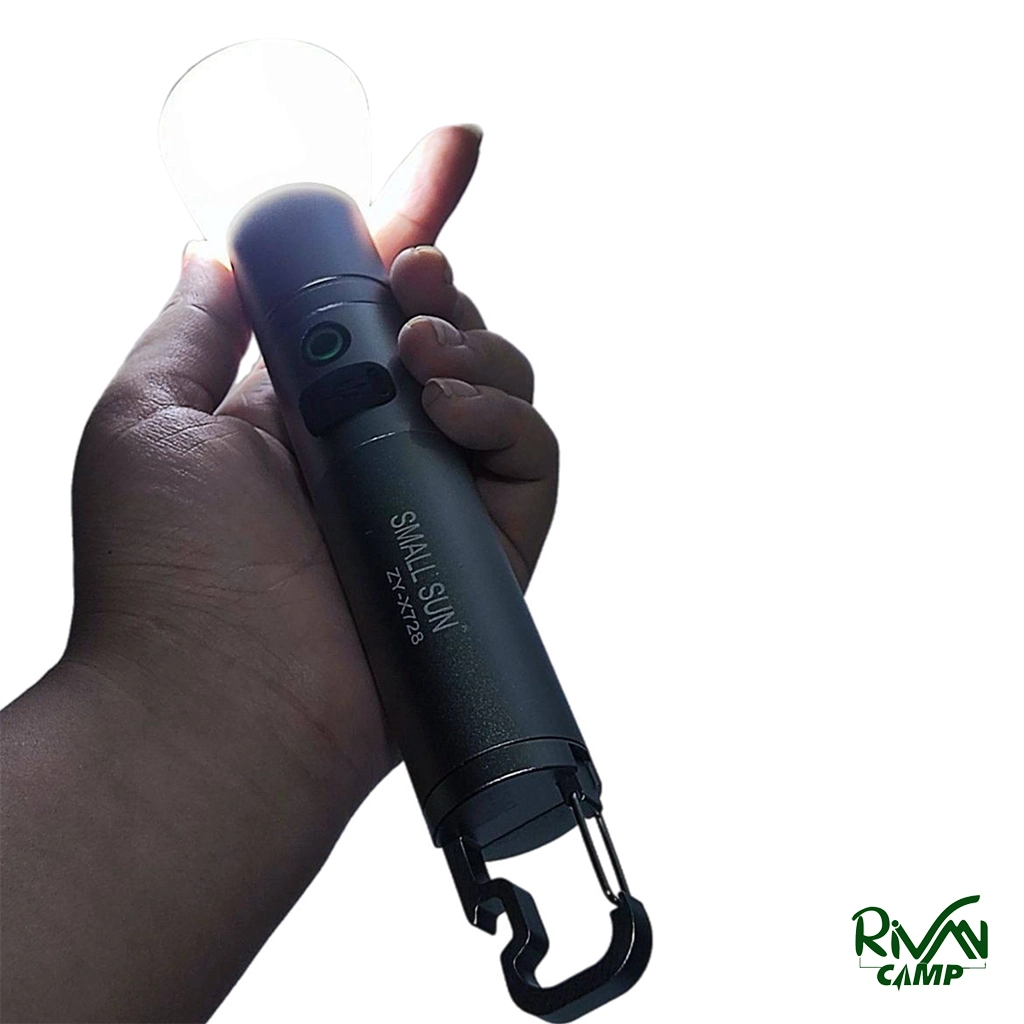 چراغ قوه فانوسدار اسمال سان مدل ZY-X728 با نور دوگانه LED مرکزی و چراغ جانبی COB با چهار حالت نور متنوع. باتری لیتیومی شارژی با پورت USB و قابلیت پاوربانک برای شارژ دستگاهها. بدنه سبک و مقاوم ABS با دسته حمل، قلاب آویز و کارابین چندکاره.