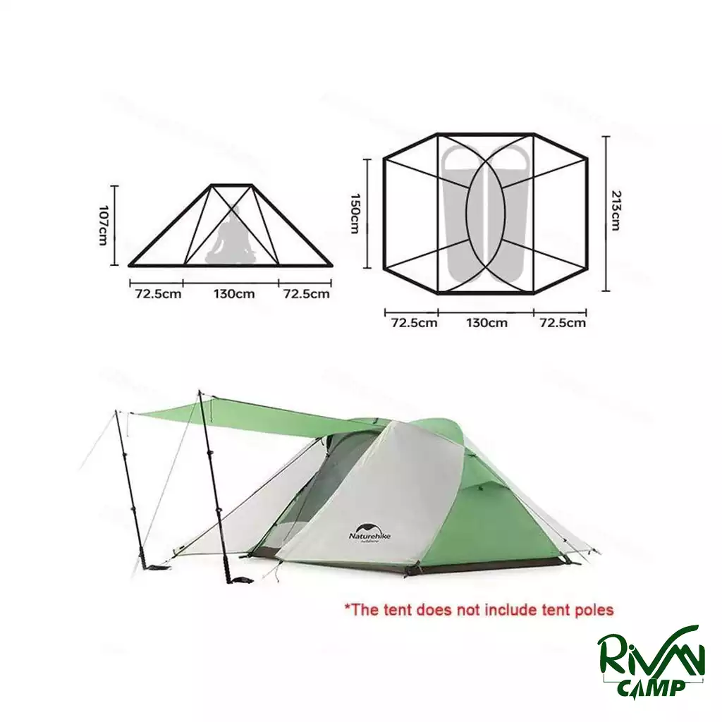 چادر دو سالن پروانهای نیچرهایک مدل NH21YW132 در حالت باز ابعادی برابر با ۲۱۳ × ۲۷۵ × ۱۰۷ سانتیمتر دارد که فضای کافی برای استراحت دو نفر و نگهداری وسایل فراهم میکند. در حالت بسته نیز به ۵۰ × ۱۸ سانتیمتر جمع میرسد و به راحتی داخل کولهپشتی جا میگیرد. وزن این جادر 2.7 کیلوگرم است و به راحتی میتوانید در کوهنوردی و کمپینگ، آن را به همراه خود ببرید.
