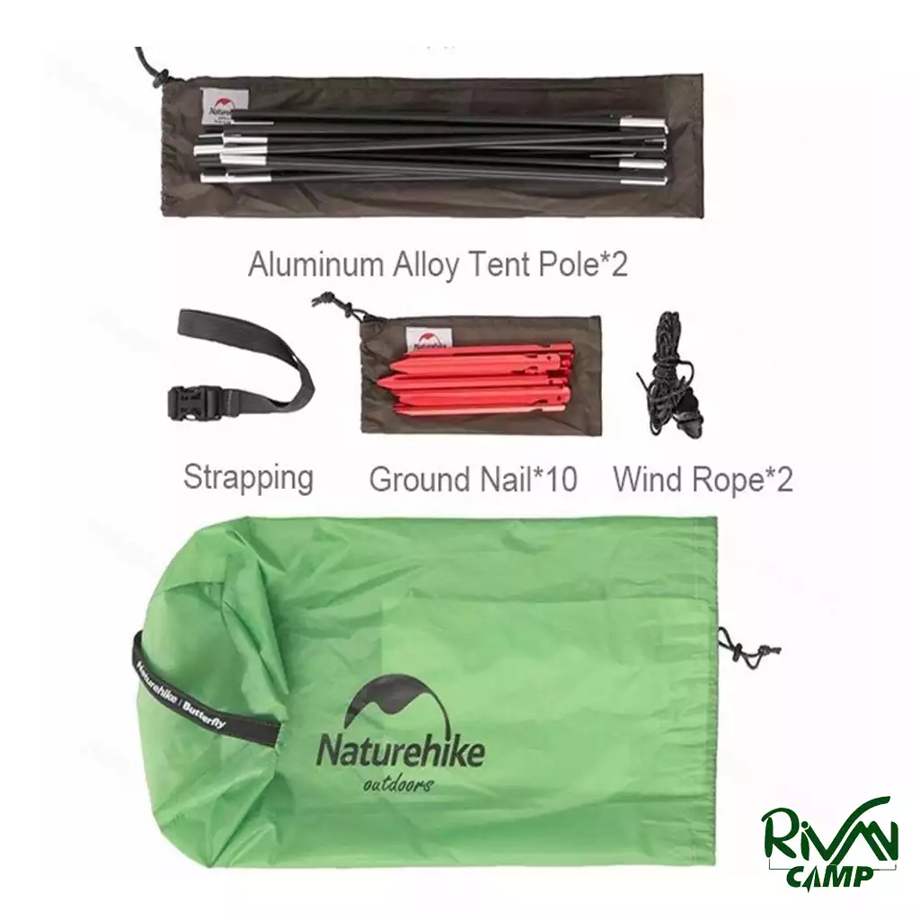 تیرکهای چادر دو سالن پروانهای نیچرهایک مدل NH21YW132 از جنس آلومینیوم 7001 تقویت شده است که علاوه بر وزن سبک، استحکام بسیار بالایی دارند. این ترکیب باعث میشود نصب و برپایی چادر سریع و ساده انجام شود و در برابر بادهای شدید نیز مقاومت کافی داشته باشد.